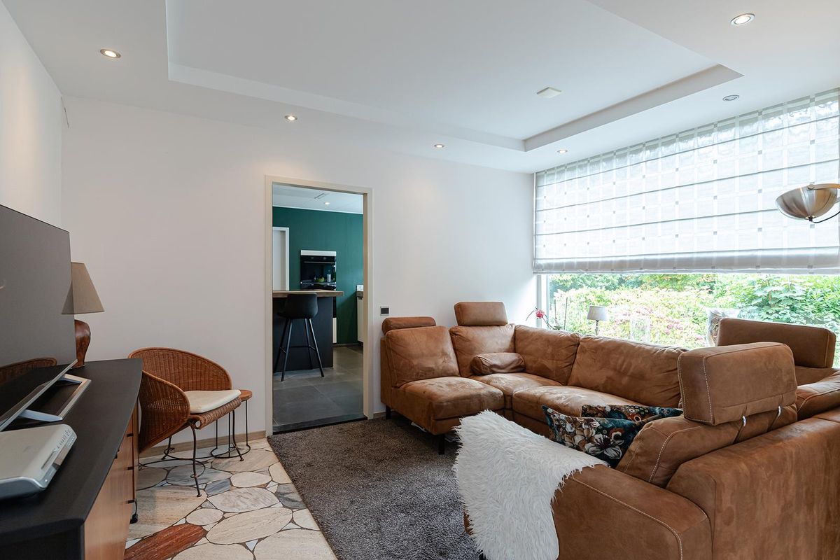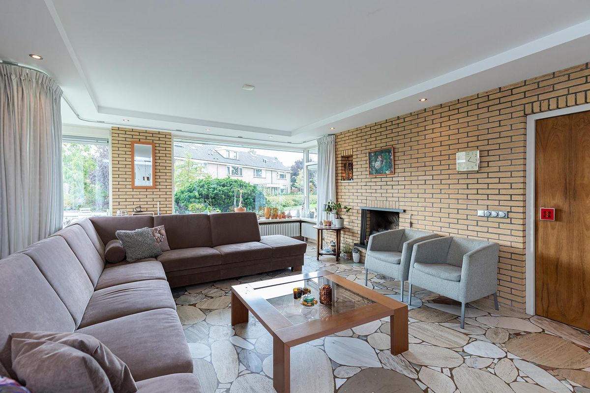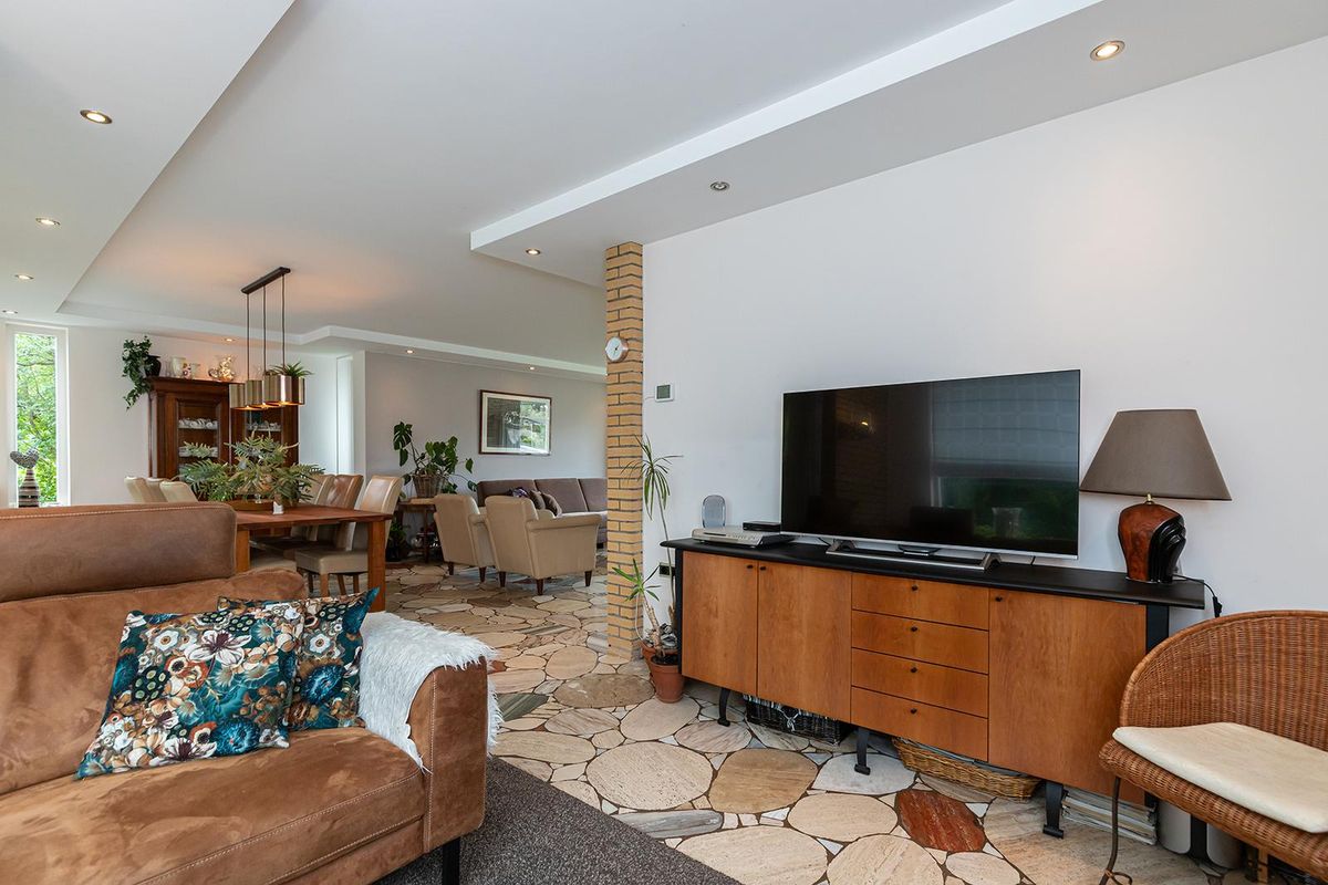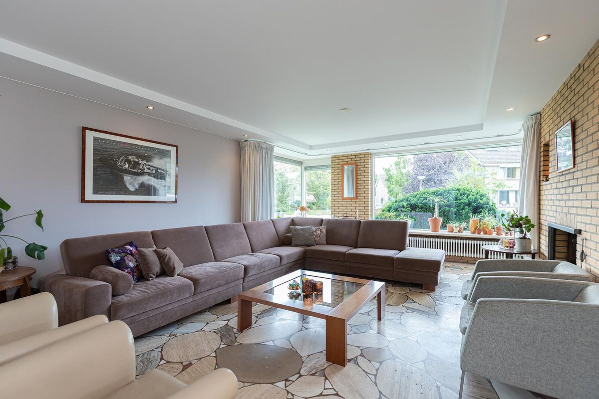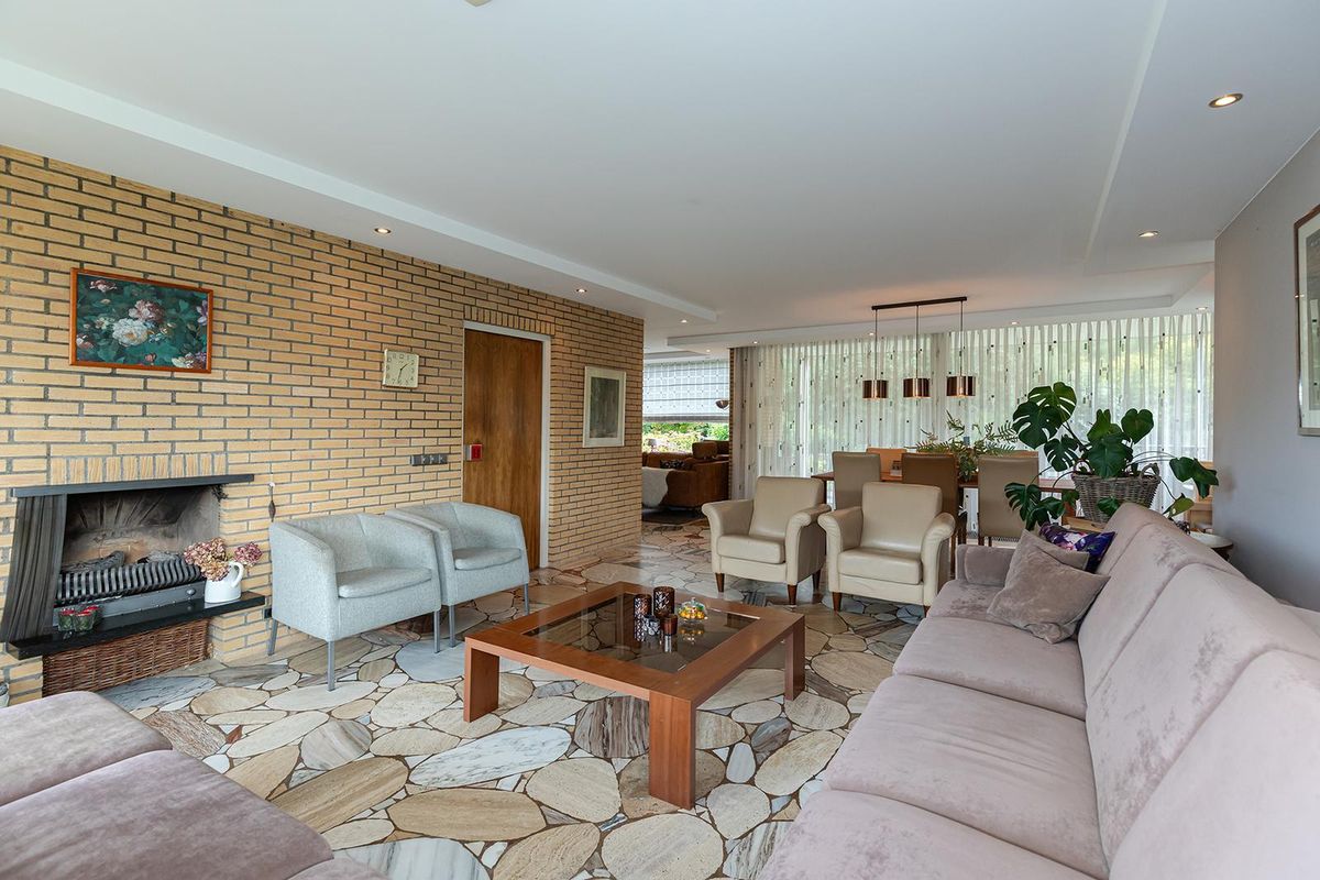 De ruime entree met garderobe en open trap vormt het hart van de woning en geeft toegang tot de verschillende vertrekken. Vanuit hier bereik je de royale woonkamer, een lichte en open leefruimte met een sfeervolle open haard die door de grote raampartijen optimaal contact heeft met de tuin. De zithoek grenst direct aan het grote terras en de beschutte buitenruimte, ideaal voor lange zomeravonden.