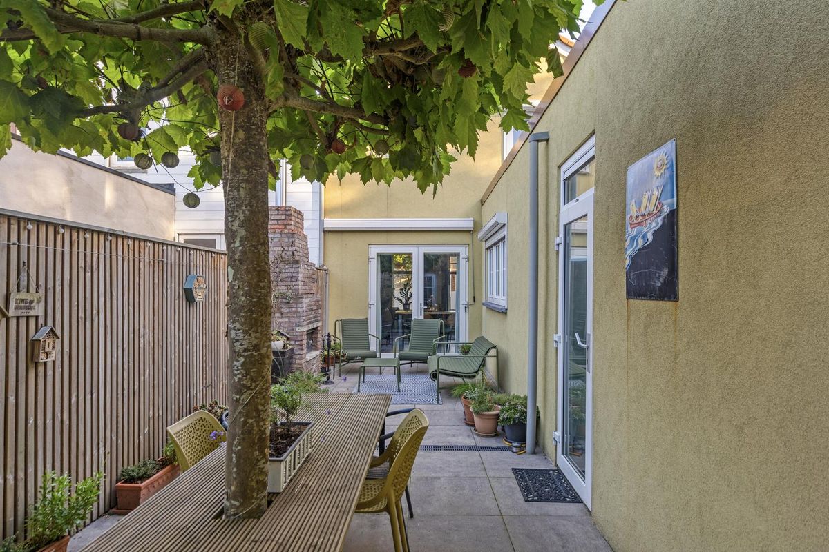 De tuin is knus, sfeervol en helemaal onderhoudsvrij. Met een vaste open-haard/grill en genoeg plek voor een eettafel en loungestoelen is dit dé plek voor zomerse avonden met vrienden of een barbecue in het weekend. Via de ruime stenen berging met elektra en extra opslagruimte heb je ook nog een achterom.