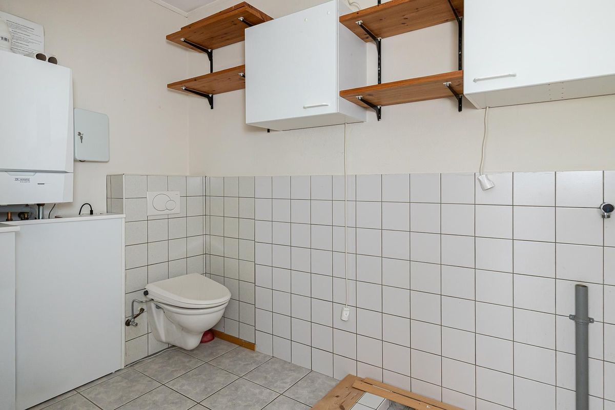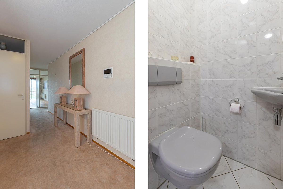 Binnenkomend via de hal heb je toegang tot bijna alle vertrekken. Er is een meterkast, garderobekast en een modern grijs-wit betegeld toilet met wandcloset en fonteintje. De woonkamer is ruim, licht en heeft direct toegang tot het zonnige terras van circa 16 m².