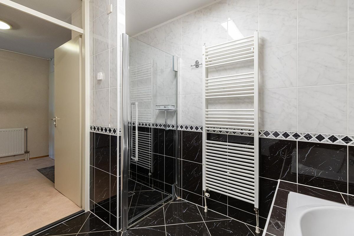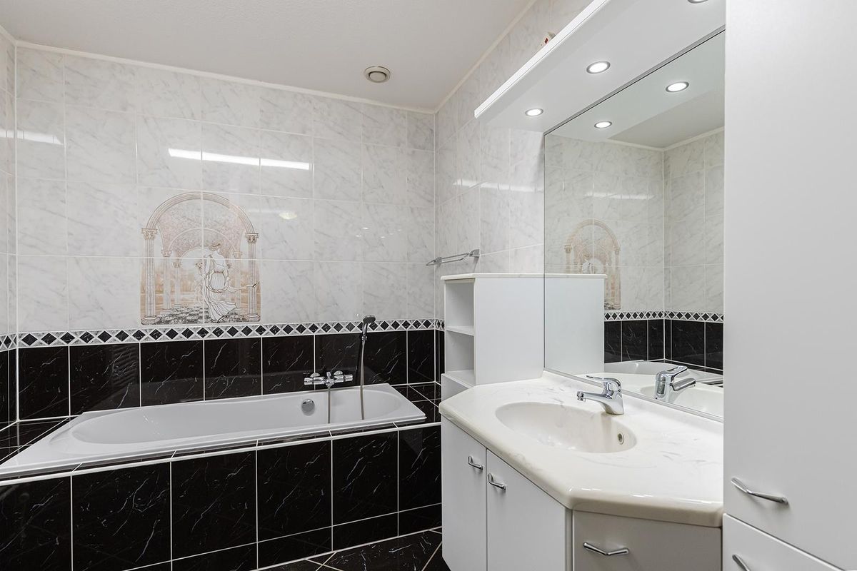 Het appartement beschikt over twee slaapkamers, waarvan één met toegang tot het terras. De badkamer is netjes onderhouden en voorzien van een ligbad, douchecabine, wastafelmeubel, kolomkast, designradiator en spiegel, betegeld in een zwart-wit marmerlook.