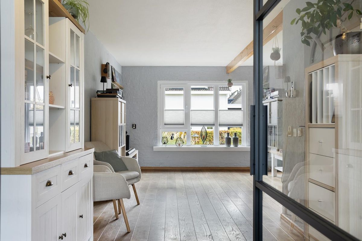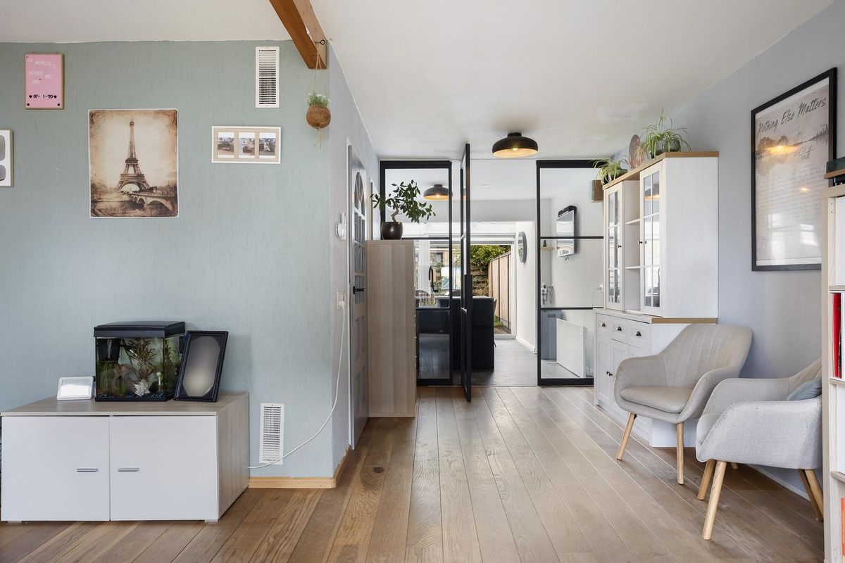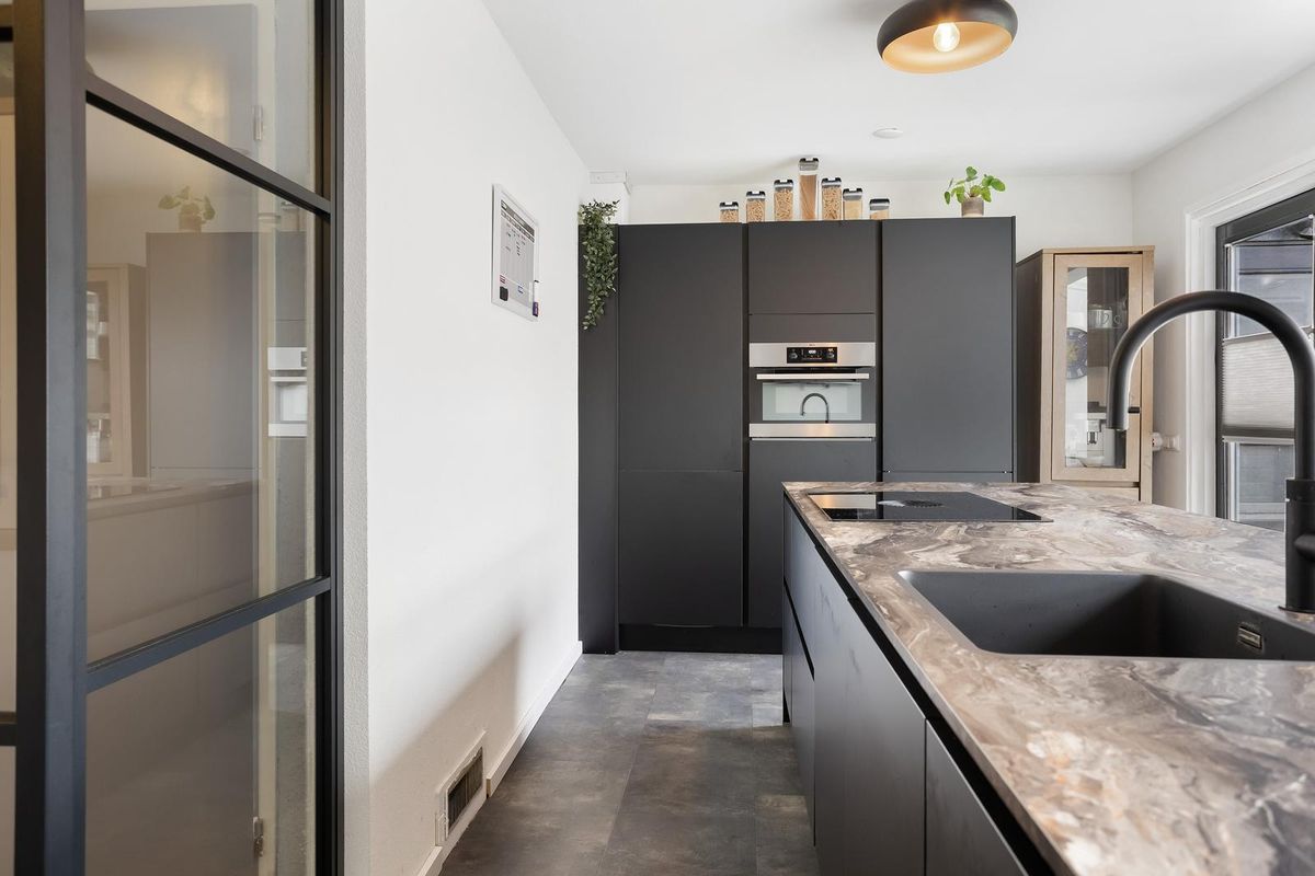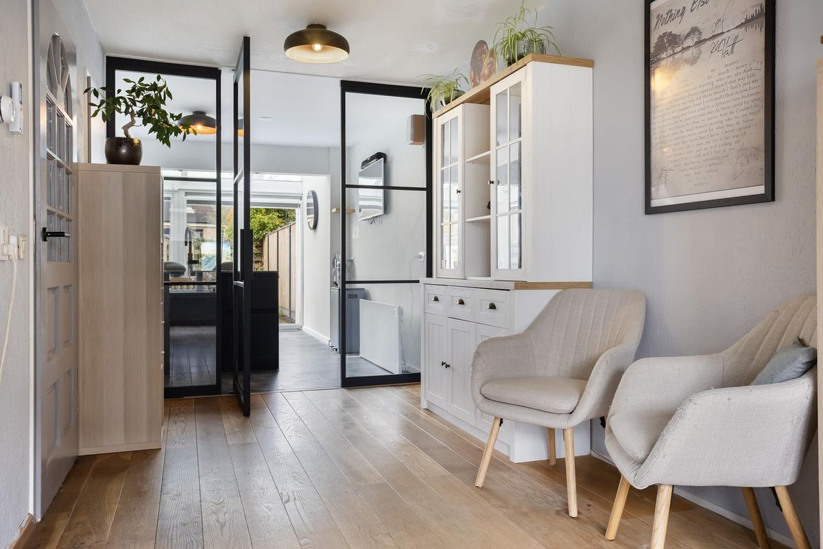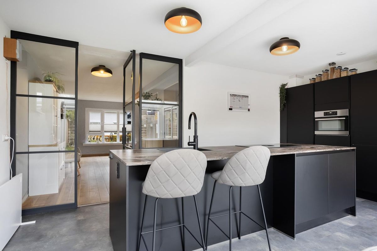 Indeling: entree in de hal met trapopgang, toilet v.v. fontein, vernieuwd meterkast met waterontharder (2025), doorgang naar de lichte en ruime L-vormige woonkamer (straatgericht) met grote proviandkast, doorgang naar het tuingerichte, uitgebouwde eetgedeelte met zeer fraaie keukenopstelling (2022) met kookeiland en v.v. een inductie kookplaat met geïntegreerde schouw, vaatwasser, Quooker, koel-/ vriescombinatie en een combi- magnetron. Vanwege de serre is er veel licht en fijne extra ruimte gerealiseerd waardoor er echt sprake is van een woonkeuken. Vanuit zowel de keuken als de serre is de tuin bereikbaar en is er een doorgang naar de aangebouwde garage met eveneens een achterom.