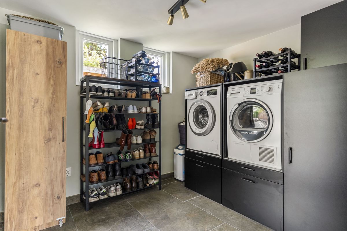 Vanuit de keuken is er toegang tot de bijkeuken; hier is ruimte voor de wasmachine en droger middels op maat gemaakte kasten én nog extra opbergruimte.