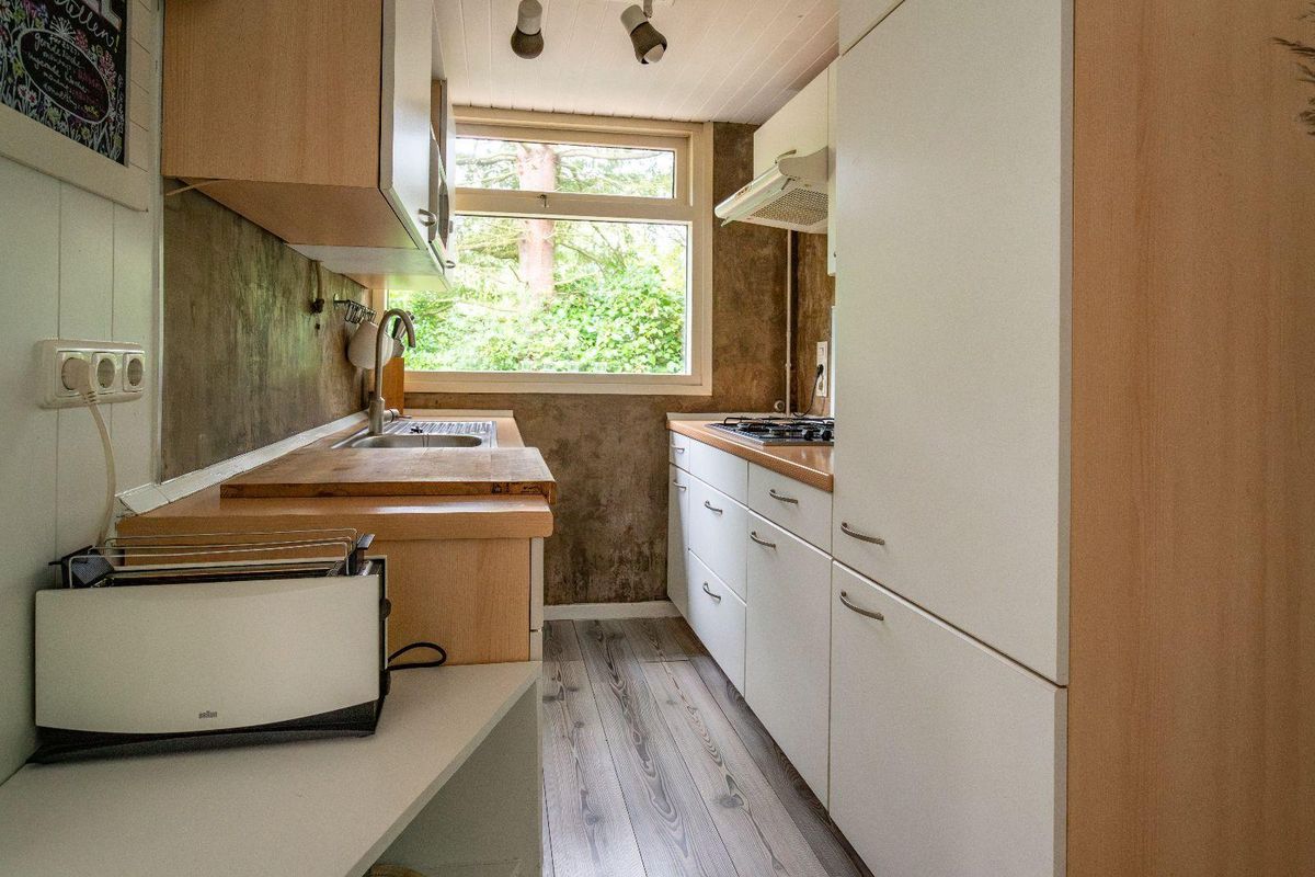 De open keuken beschikt over een 4-pits gaskookplaat, een vaatwasser, een koelkast met vriesvak en een magnetron.