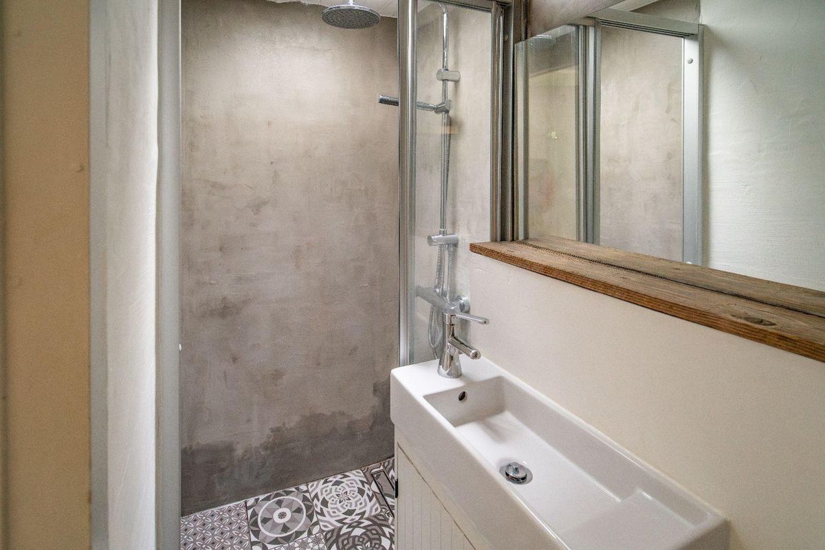 De badkamer is uitgerust met een douche, een wastafel en een toilet.
