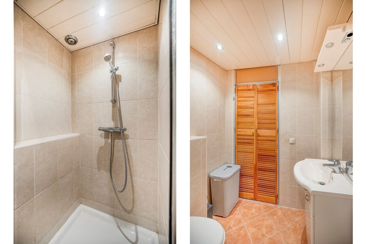 De badkamer ligt centraal op de verdieping en beschikt over een toilet, grote douche en een wastafel met meubel. Niet nieuw, maar keurig onderhouden en nog prima te gebruiken.