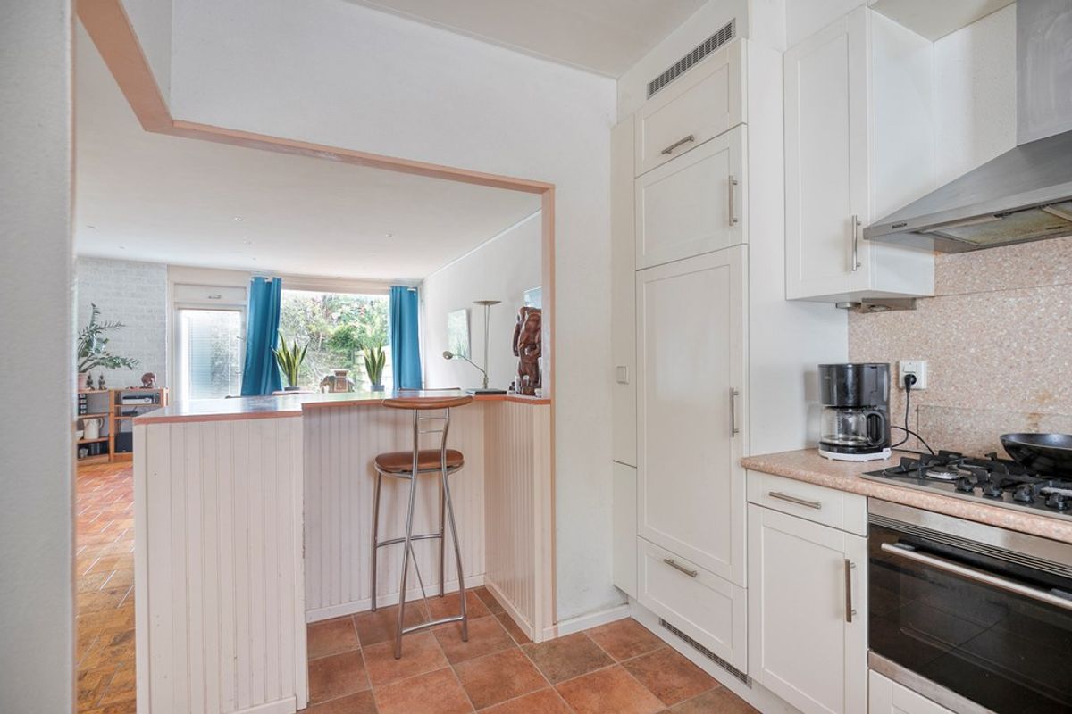 Aan de voorzijde ligt de open keuken. Deze is netjes en voorzien van diverse inbouwapparatuur, zoals een koelkast, 5-pits gaskookplaat, afzuigkap, magnetron met ovenfunctie. Niet meer helemaal van nu, maar functioneel en een mooie basis om te moderniseren naar je eigen smaak.