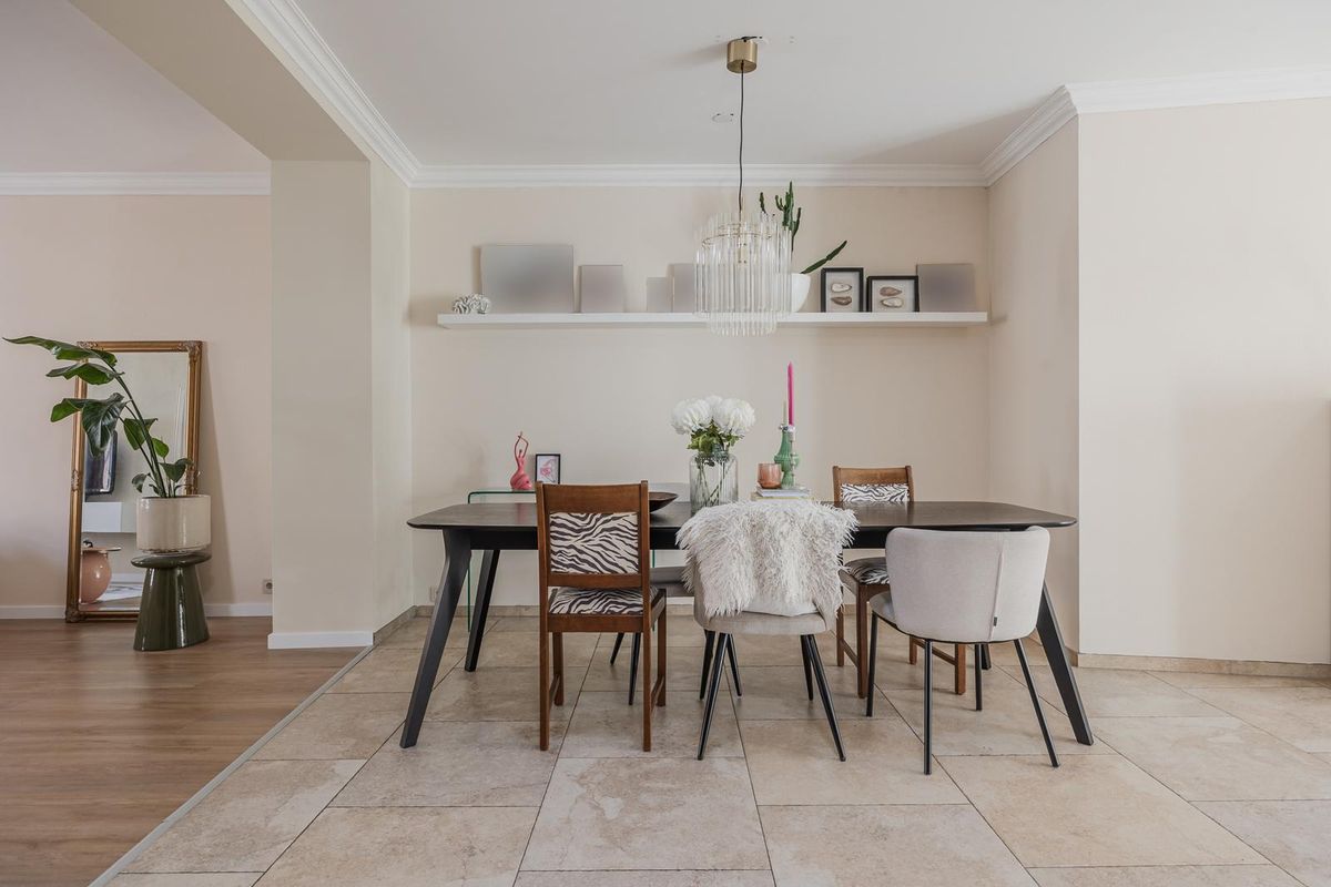Het eetgedeelte van de woonkamer met laminaatvloer sluit aan op de keuken. De openslaande deuren bieden direct toegang tot de tuin.