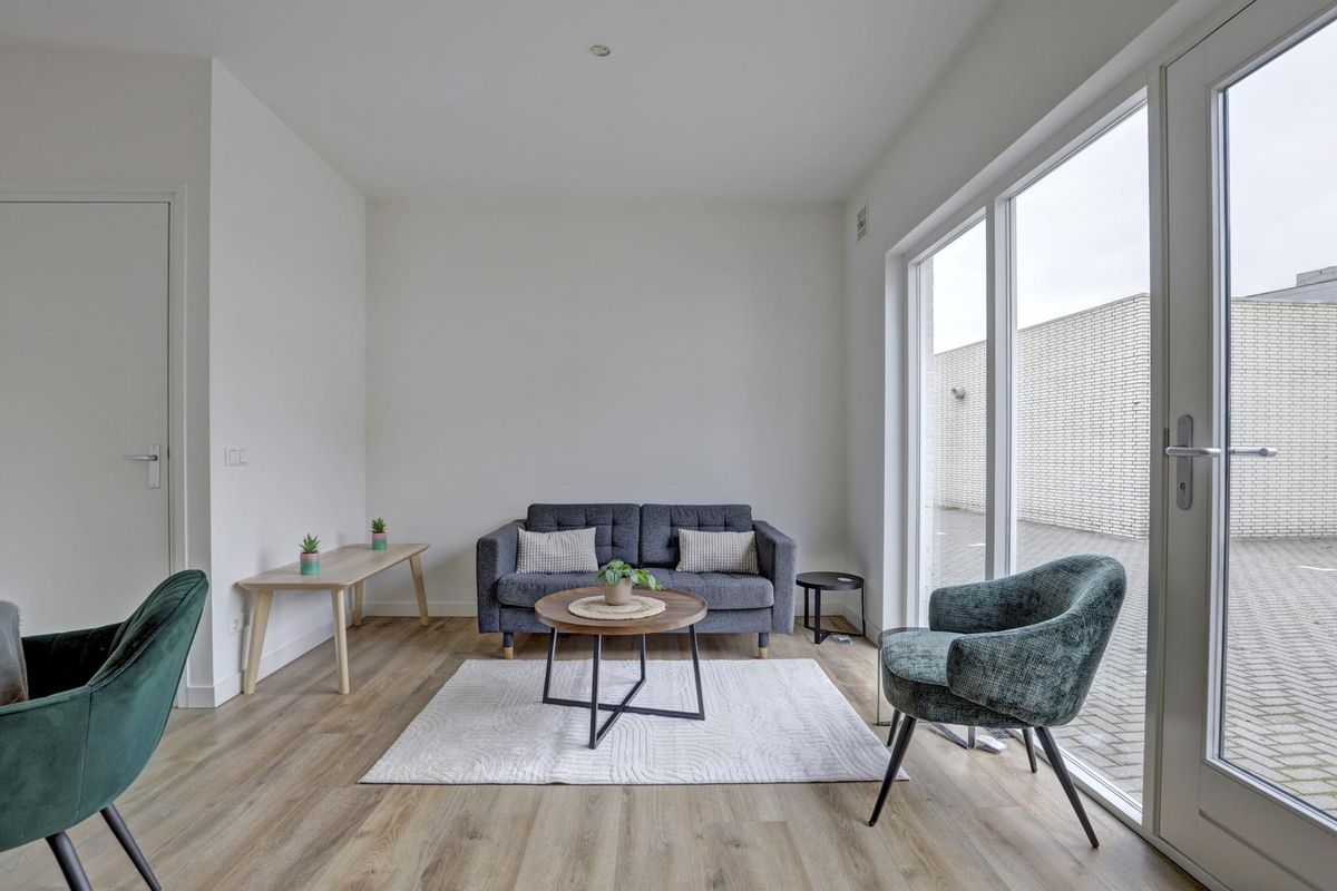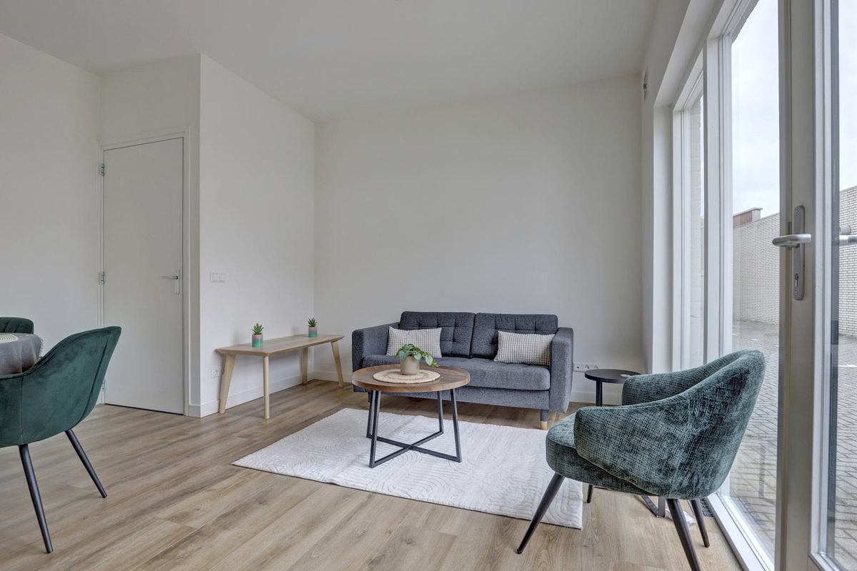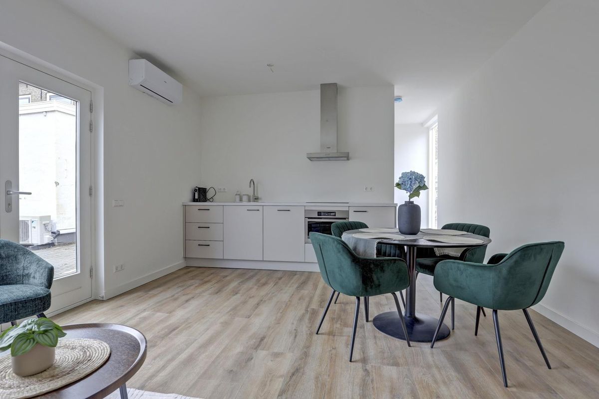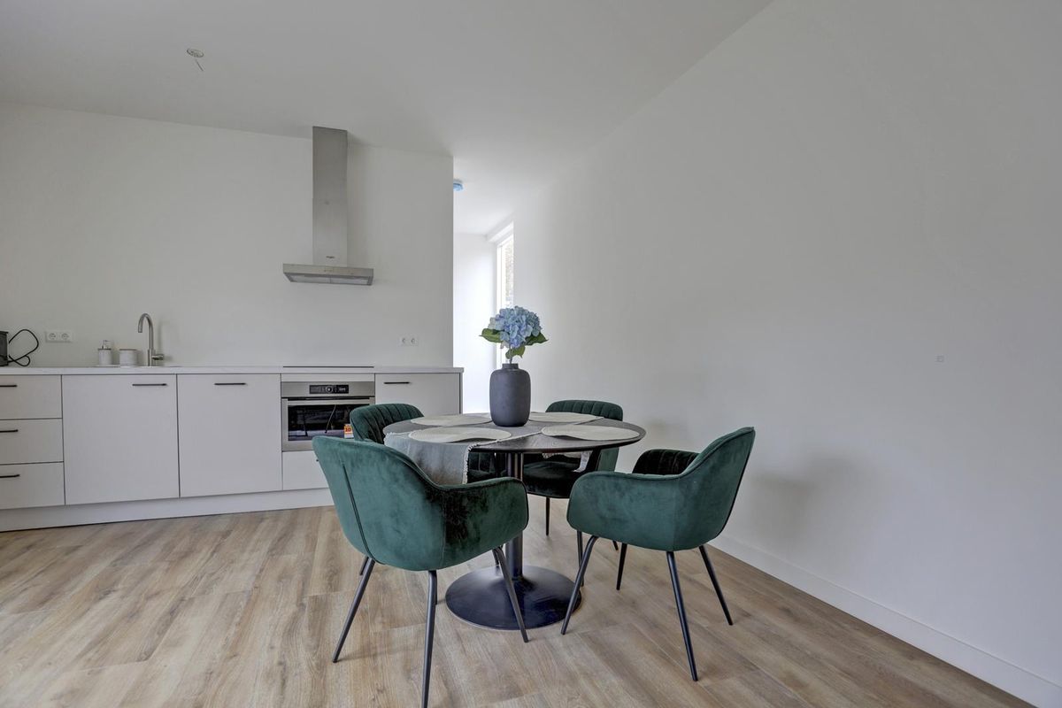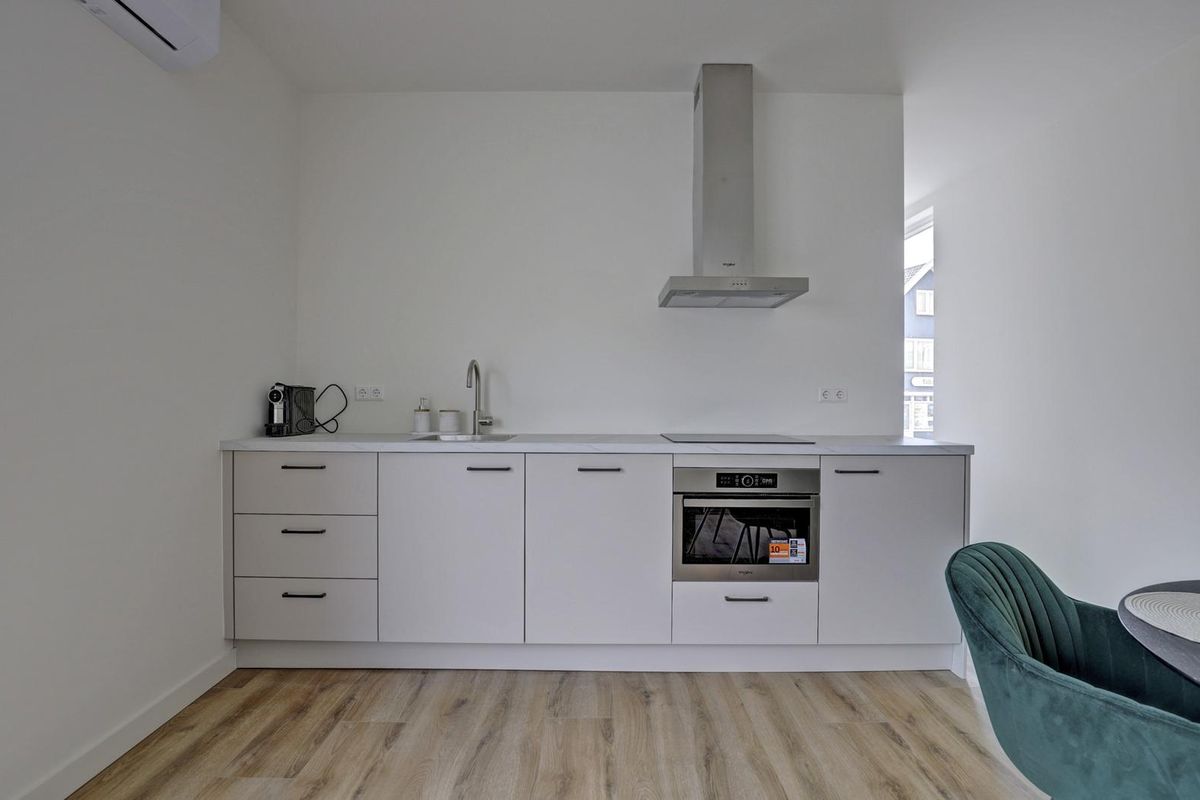 De woonkamer is strak afgewerkt met een moderne laminaat vloer en witte wanden, waardoor de ruimte een frisse en eigentijdse uitstraling heeft. De open keuken in lichte kleurstelling is voorzien van diverse inbouwapparatuur, waaronder een kookplaat, afzuigkap, oven en koelkast. Hier kook je met gemak een maaltijd voor twee, terwijl je geniet rust en privacy met uitzicht richting het afgesloten binnenterrein.