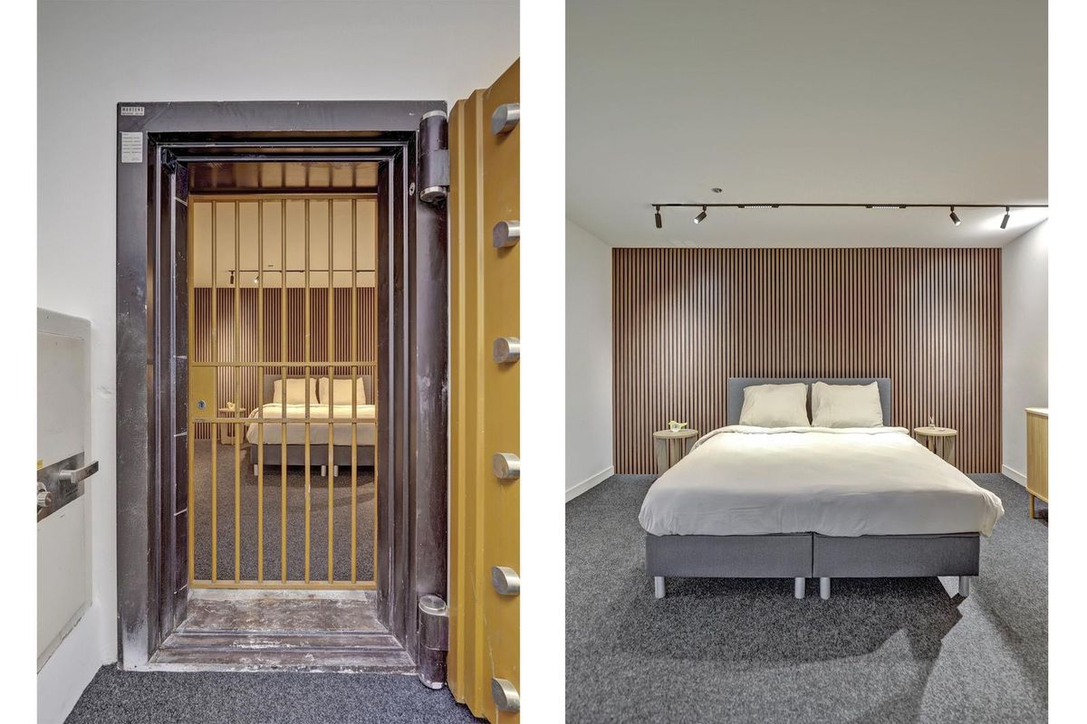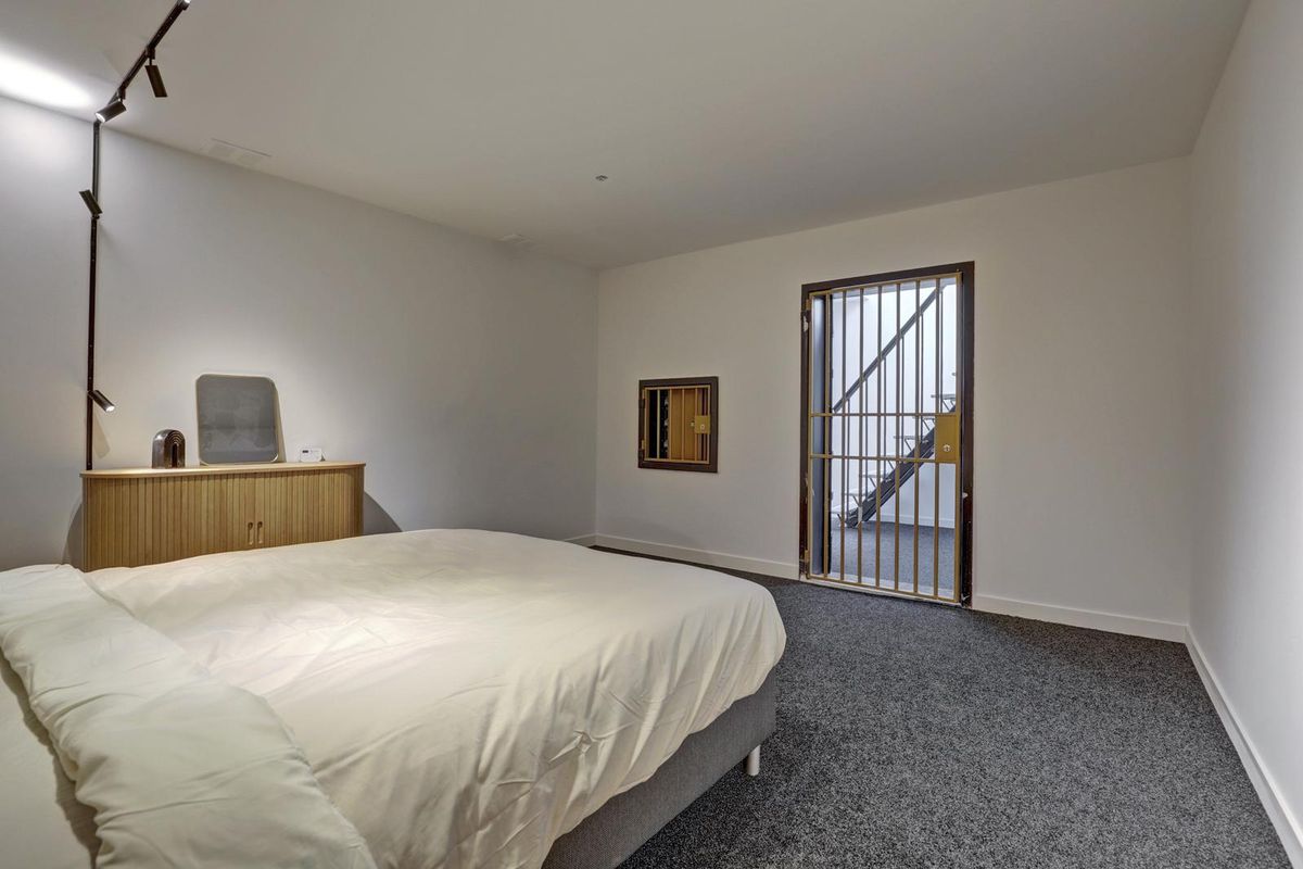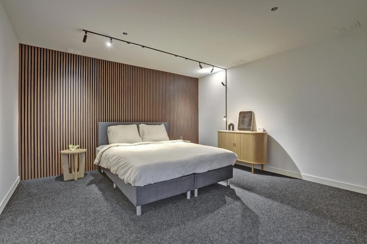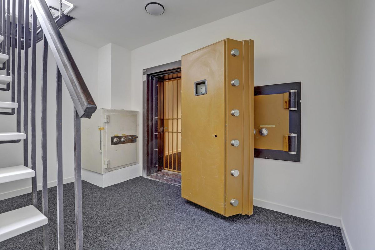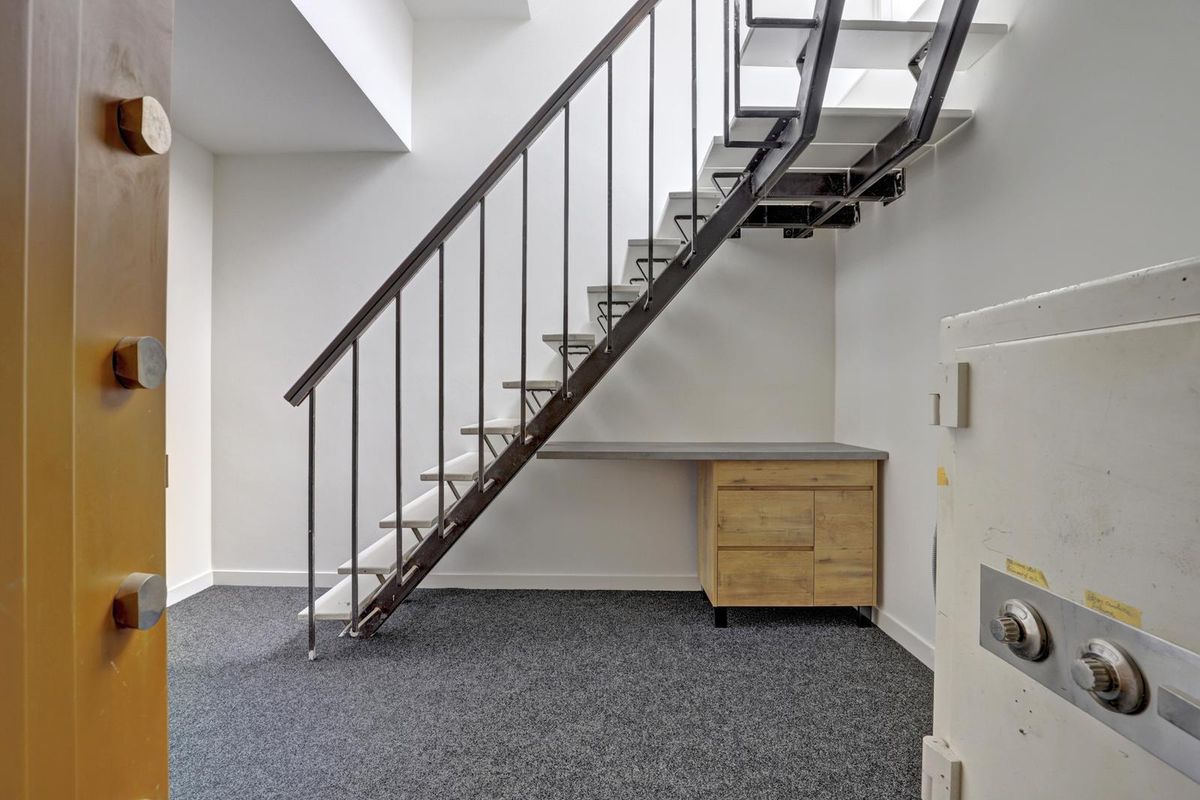 Een vaste trap leidt naar het verrassend ruime souterrain, waar zich de slaapkamer bevindt. Dit souterrain is de voormalige kluis van het gebouw, welke nog steeds intact is en nu is ingericht als slaapkamer! Deze ruimte is sfeervol ingericht met een warme afwerking, tapijtvloer en een stijlvolle lattenwand. De goede indeling biedt voldoende plaats voor een groot bed en kastruimte. Dankzij de verlichting en het strakke afwerkingsniveau voelt het souterrain prettig en comfortabel aan. Een bijzonder detail is de originele kluisdeur, een verwijzing naar de geschiedenis van het gebouw. Een knipoog naar het verleden met een moderne woonfunctie.
