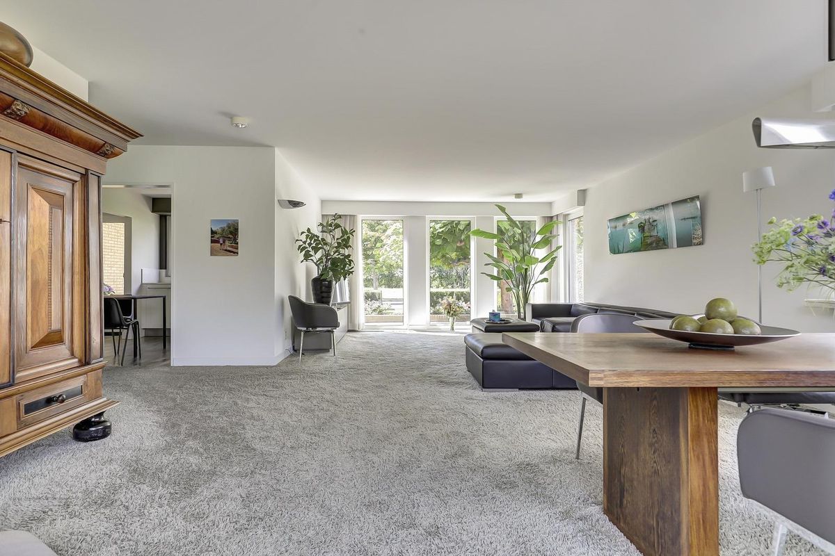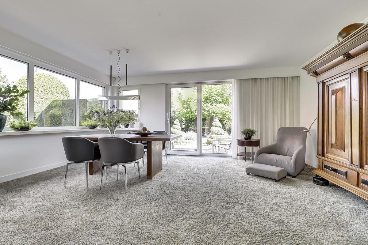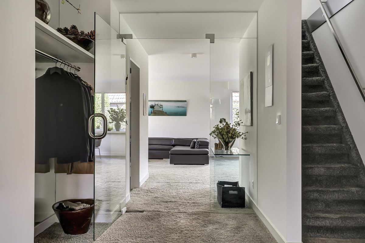 De voortuin is keurig aangelegd met strak gesnoeide hagen en volwassen bomen die de woning een statige entree geven. Via de ruime oprit voor meerdere voertuigen bereikt u de entree en de inpandige garage. Binnen komt u in een lichte hal met glazen deuren en een vaste trapopgang, voorzien van een stijlvolle donkergrijze vloerbedekking. Vanuit de entree heeft u toegang tot de slaapkamer, garage, badkamer, separaat toilet en meterkast. Vanuit de hal stapt u de royale woonkamer binnen. Deze ruimte is uitgevoerd met lichte wanden en een hoogpolig, zachtgrijs tapijt dat direct warmte en comfort biedt. Grote raampartijen aan zowel de voor- als achterzijde zorgen voor veel daglicht. Vanuit de woonkamer heeft u een prachtig zicht op de tuin en via de glazen schuifdeuren loopt u zo het terras op.