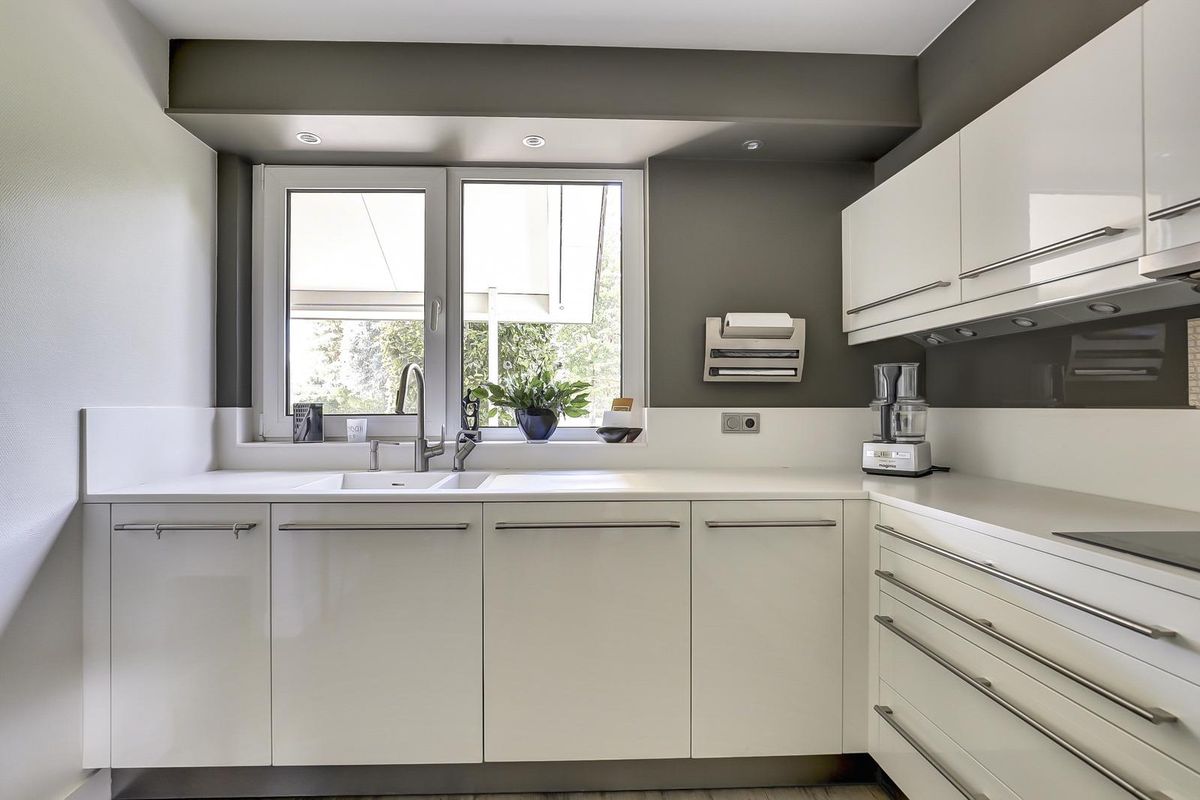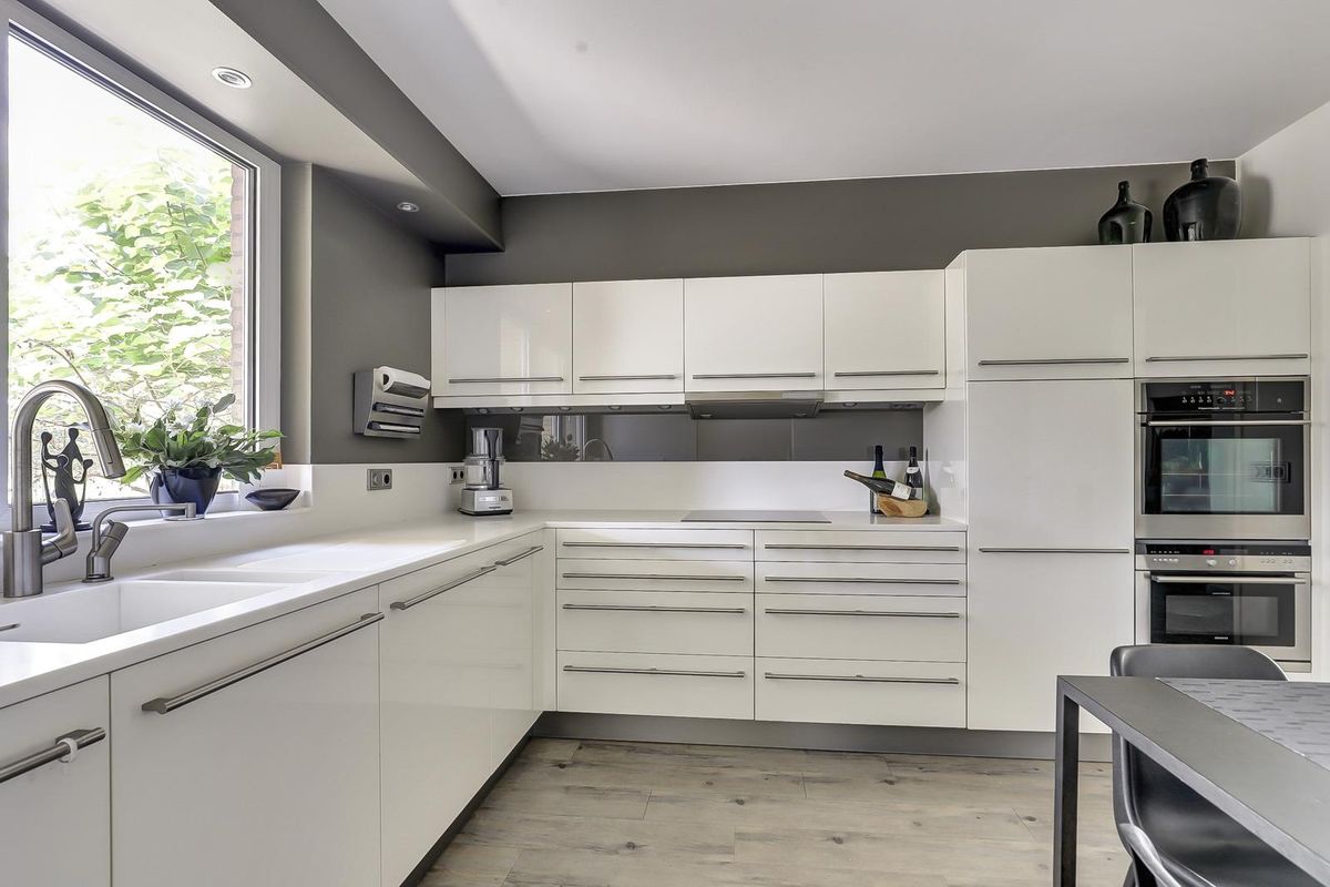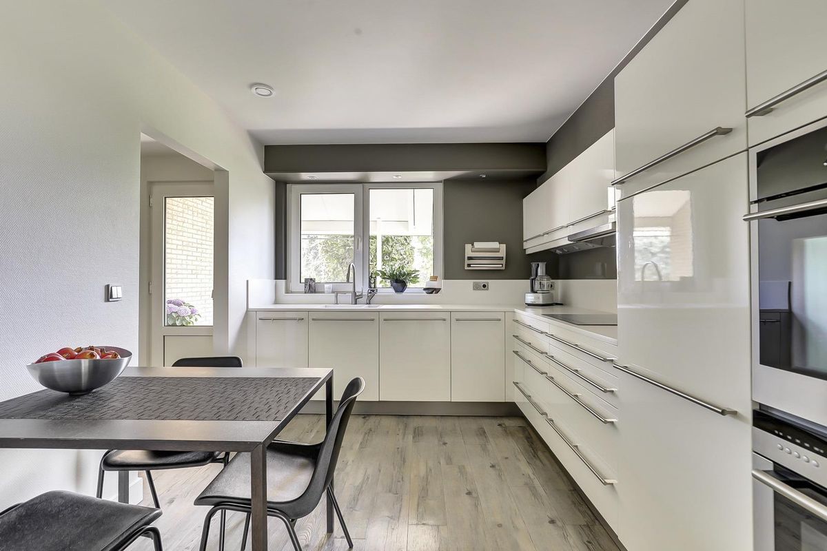 De eetkamer grenst direct aan de woonkamer en biedt ruimte voor een grote eettafel. Ook hier domineren licht, ruimte en verbinding met de tuin. De woonkeuken is modern uitgevoerd in hoogglans wit met een strak werkblad en een lichte vloer. Alle benodigde inbouwapparatuur is aanwezig, waaronder een oven, magnetron, inductiekookplaat, afzuigkap, quooker, koelkast en vaatwasser. Vanuit de keuken heeft u toegang tot de praktische bijkeuken, die extra bergruimte biedt en plaats voor bijvoorbeeld een wasmachine, droger en extra koel- of vrieskast. Dankzij de deur naar buiten is dit een ideale ruimte voor dagelijkse in- en uitloop en voor het netjes opbergen van huishoudelijke apparatuur en voorraad.