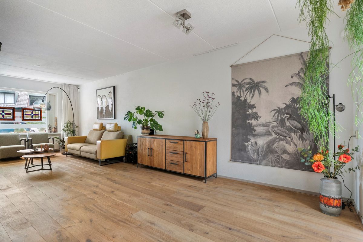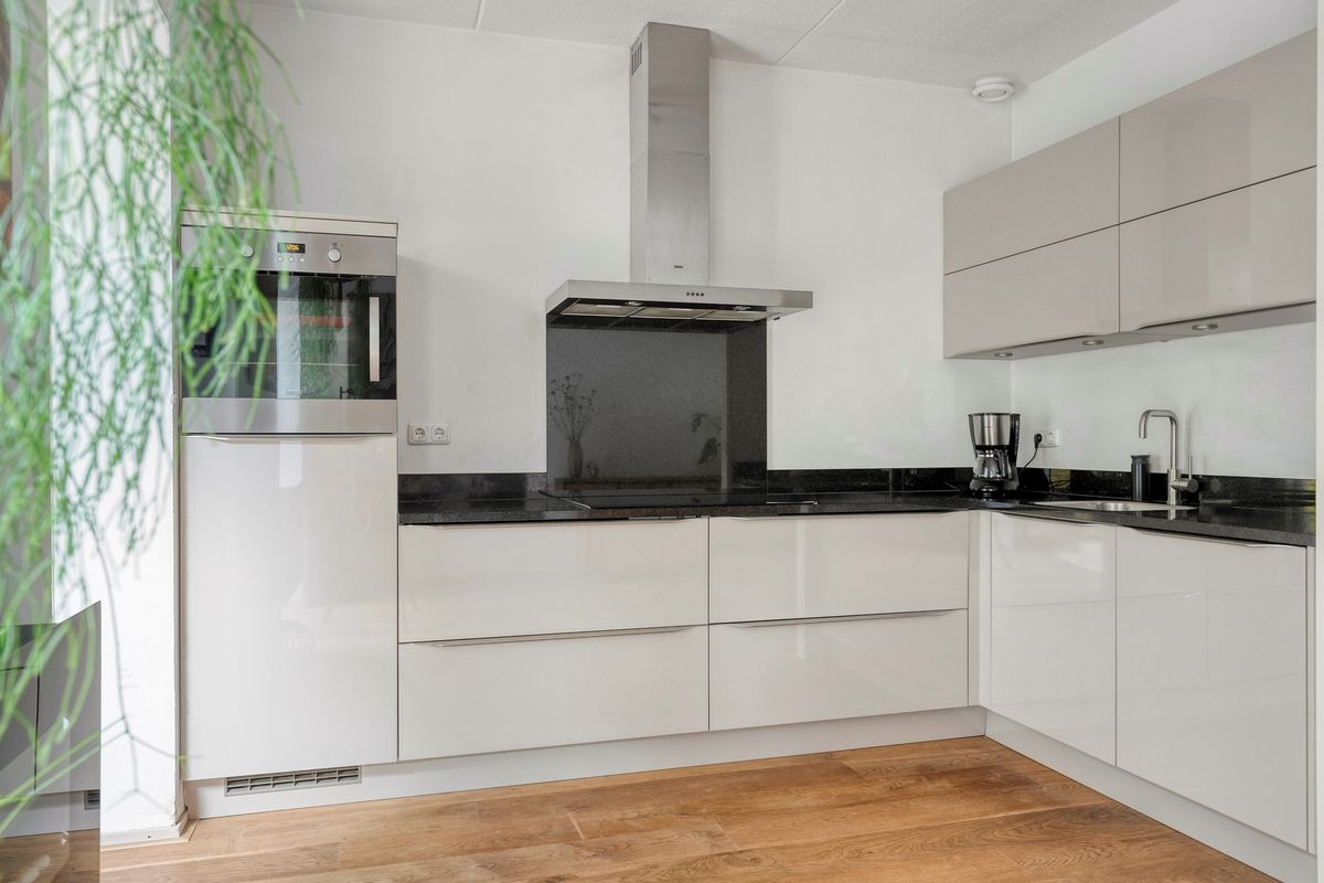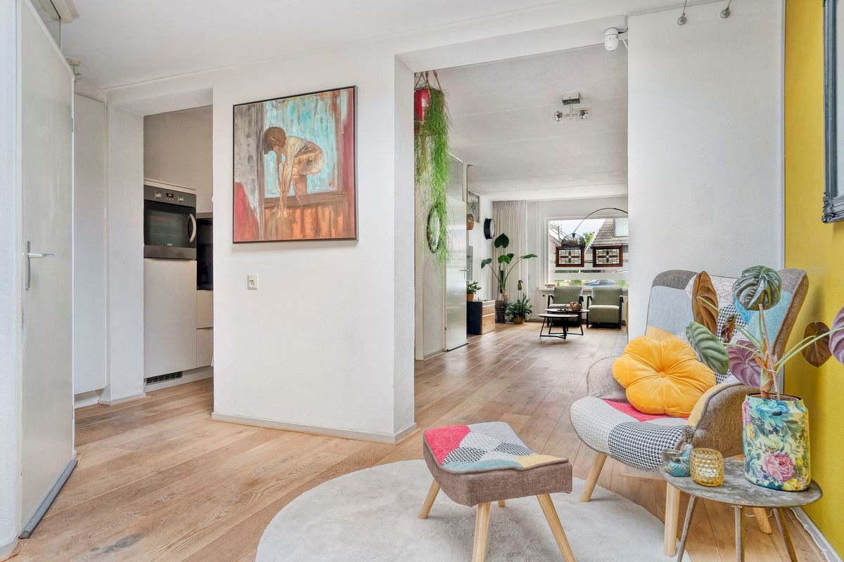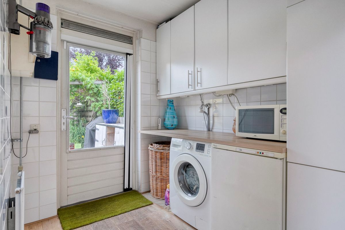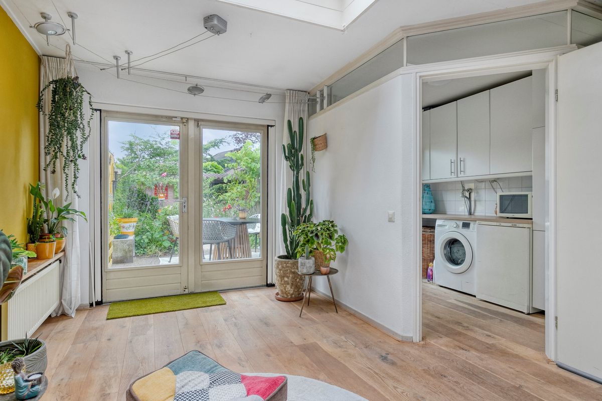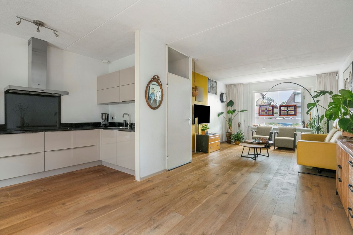 Je komt binnen in de hal met toilet en loopt direct door naar de verrassend ruime woonkamer. De eikenhouten vloer met vloerverwarming, het lichtinval en de openslaande tuindeuren geven meteen een warme, sfeervolle indruk. Dankzij de aanbouw heb je nog meer licht en ruimte, perfect voor een royale eethoek of speelhoek. Het moderne open kasjmier crèmekleurige keuken (2017) is van alle gemakken voorzien zoals inductie koken (2024), vaatwasser, oven-grill, koelkast en het zwart marmerenblad maakt de keuken een plaatje. De bijkeuken is afgesloten met een deur en via deze deur loop je zo de tuin in.