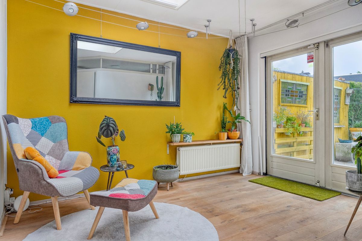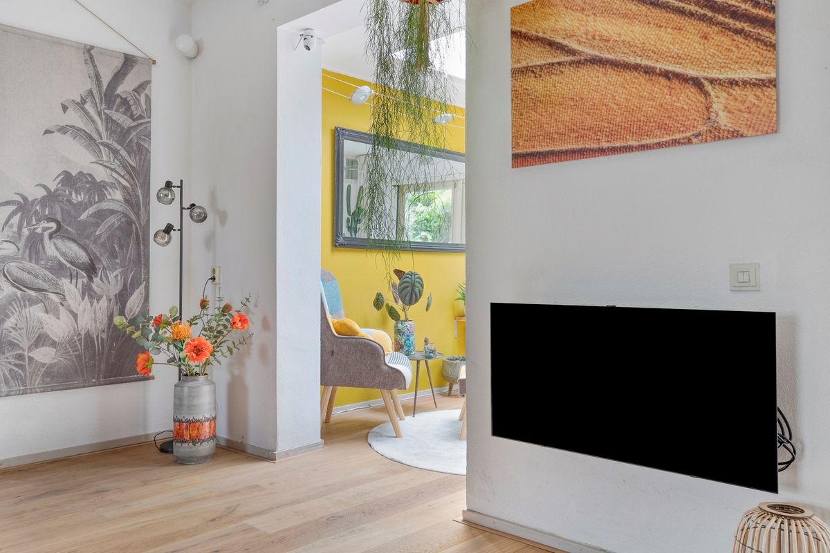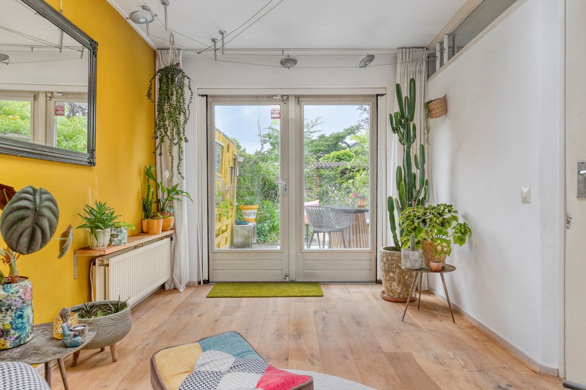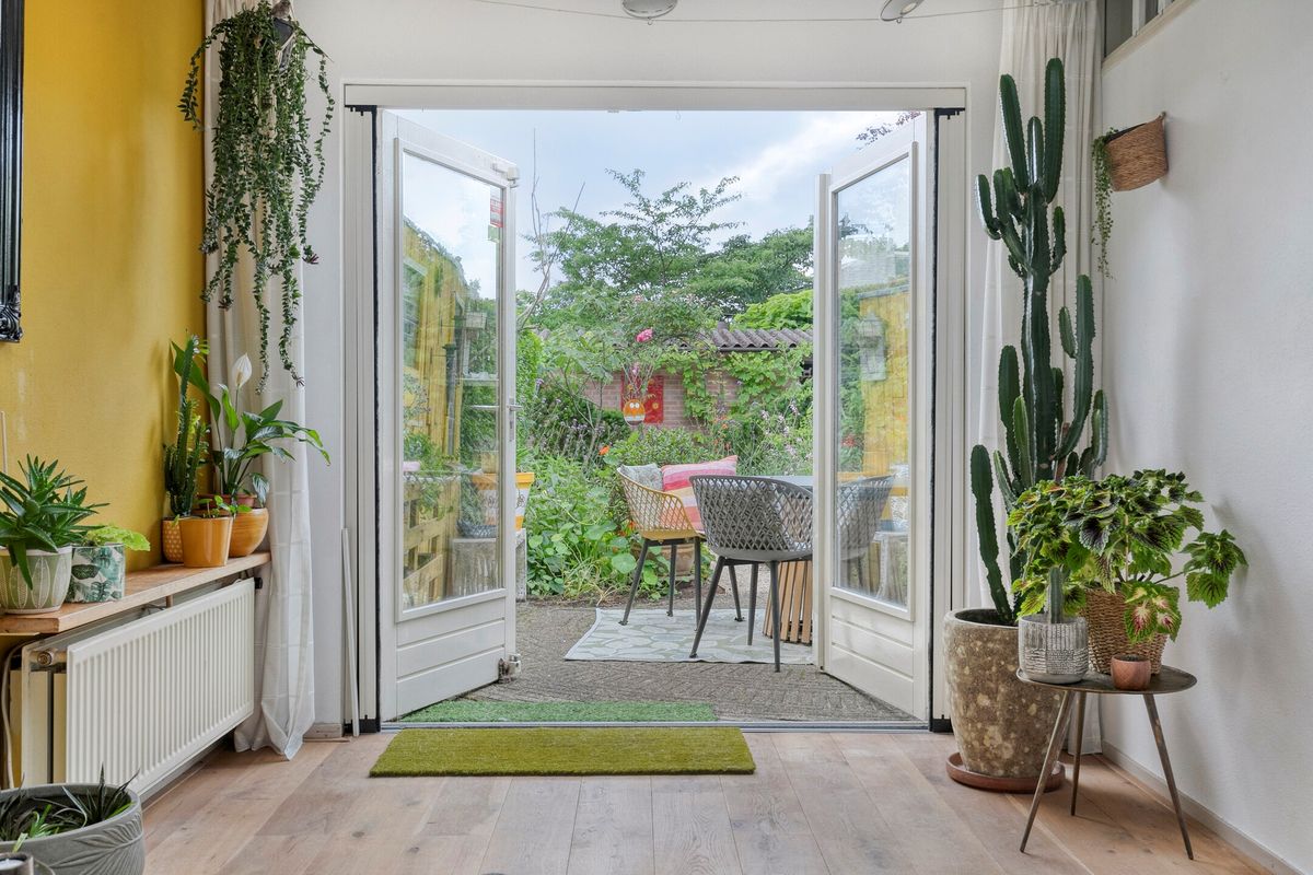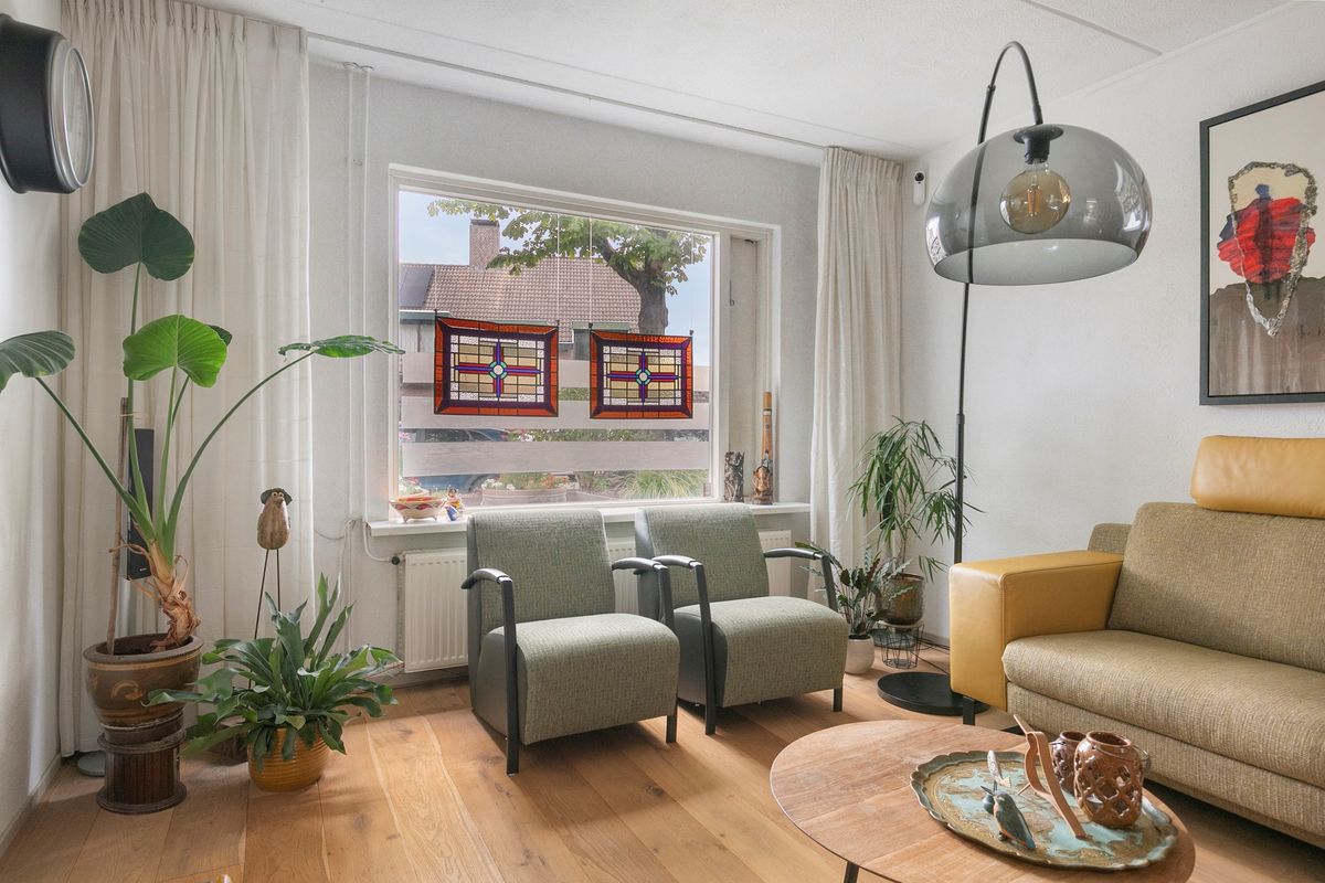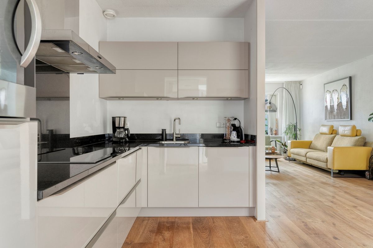 Je komt binnen in de hal met toilet en loopt direct door naar de verrassend ruime woonkamer. De eikenhouten vloer met vloerverwarming, het lichtinval en de openslaande tuindeuren geven meteen een warme, sfeervolle indruk. Dankzij de aanbouw heb je nog meer licht en ruimte, perfect voor een royale eethoek of speelhoek. Het moderne open kasjmier crèmekleurige keuken (2017) is van alle gemakken voorzien zoals inductie koken (2024), vaatwasser, oven-grill, koelkast en het zwart marmerenblad maakt de keuken een plaatje. De bijkeuken is afgesloten met een deur en via deze deur loop je zo de tuin in.