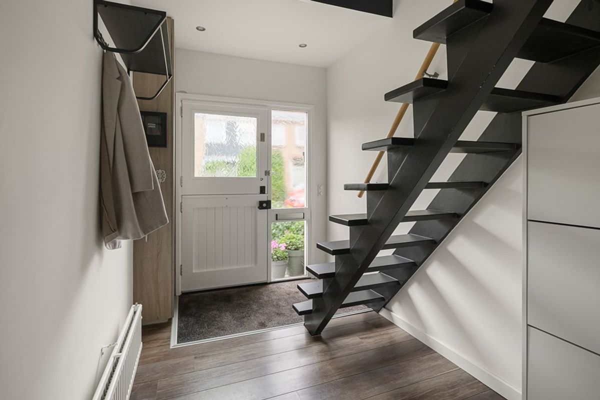 De voortuin is verzorgd aangelegd met sierlijke beplanting, steentjes en twee karakteristieke trompetboompjes, en leidt naar de entree. Binnen in de hal vind je de meterkast (recent volledig vernieuwd, inclusief de elektrische installatie en leidingen), het toilet en de trapopgang.