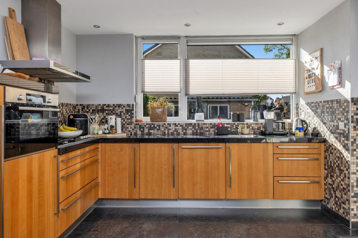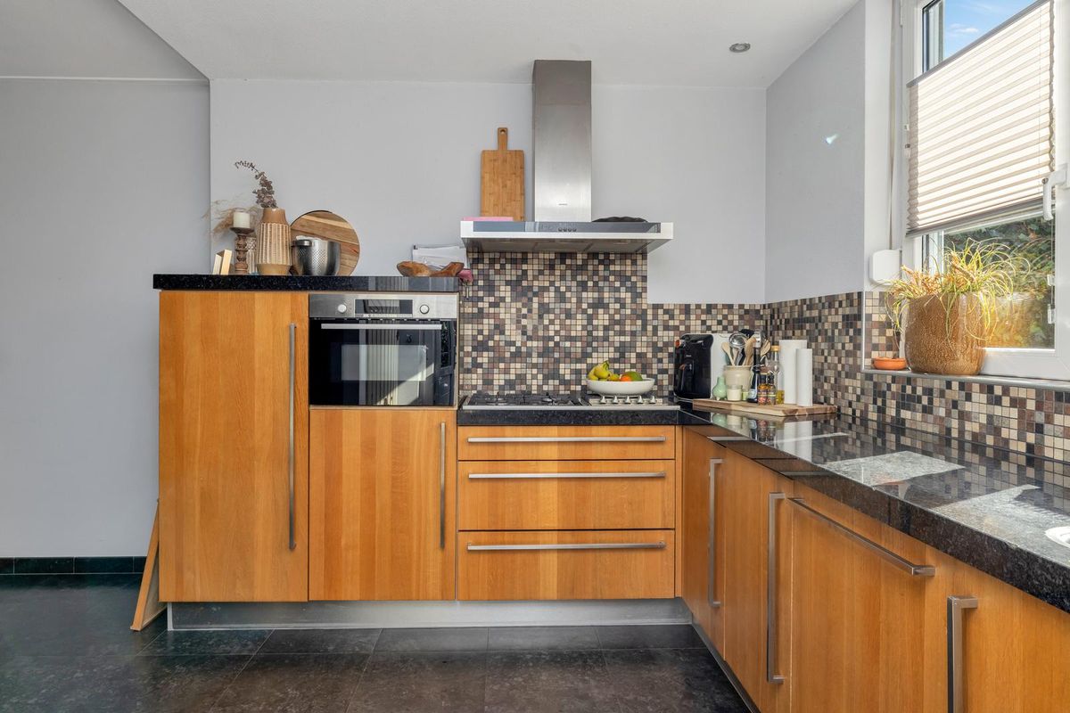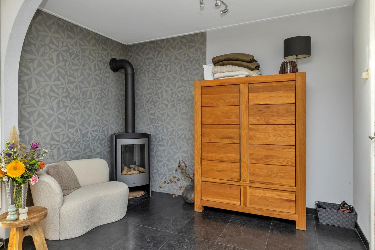 Entree/hal met toiletruimte (zwevend toilet en fonteintje), trapopgang, meterkast en kelderkast. Ruime, uitgebouwde woonkamer met plavuizenvloer, gassfeerhaard en erker aan de voorzijde. Open keuken in hoekopstelling, voorzien van diverse inbouwapparatuur zoals: