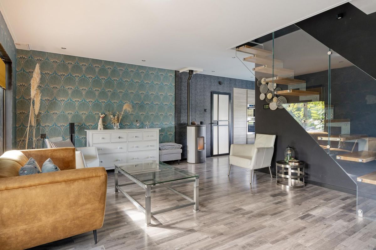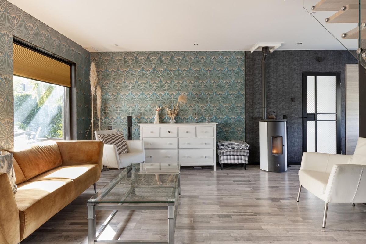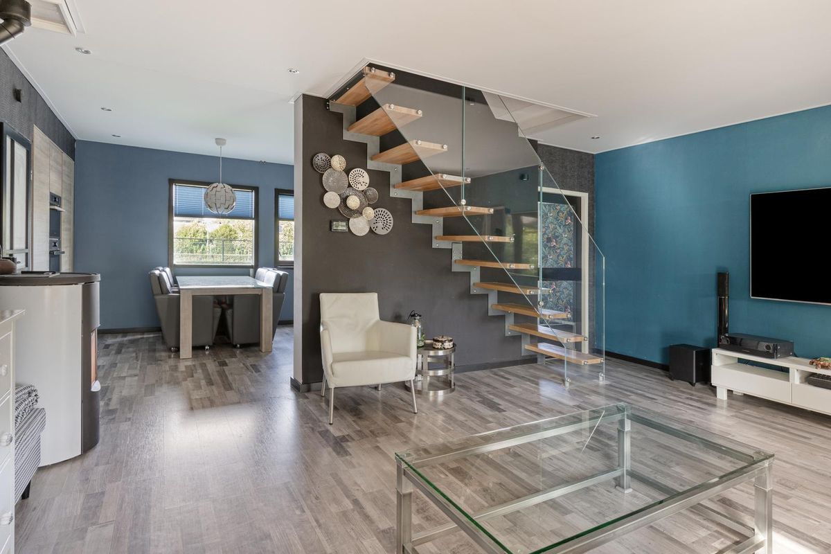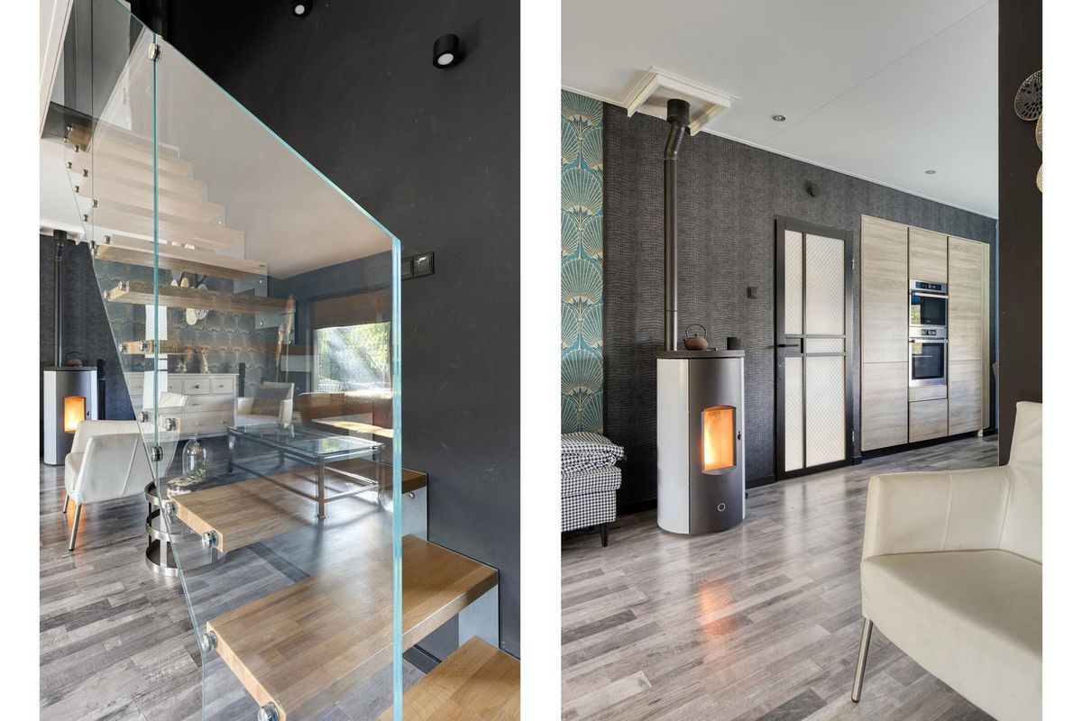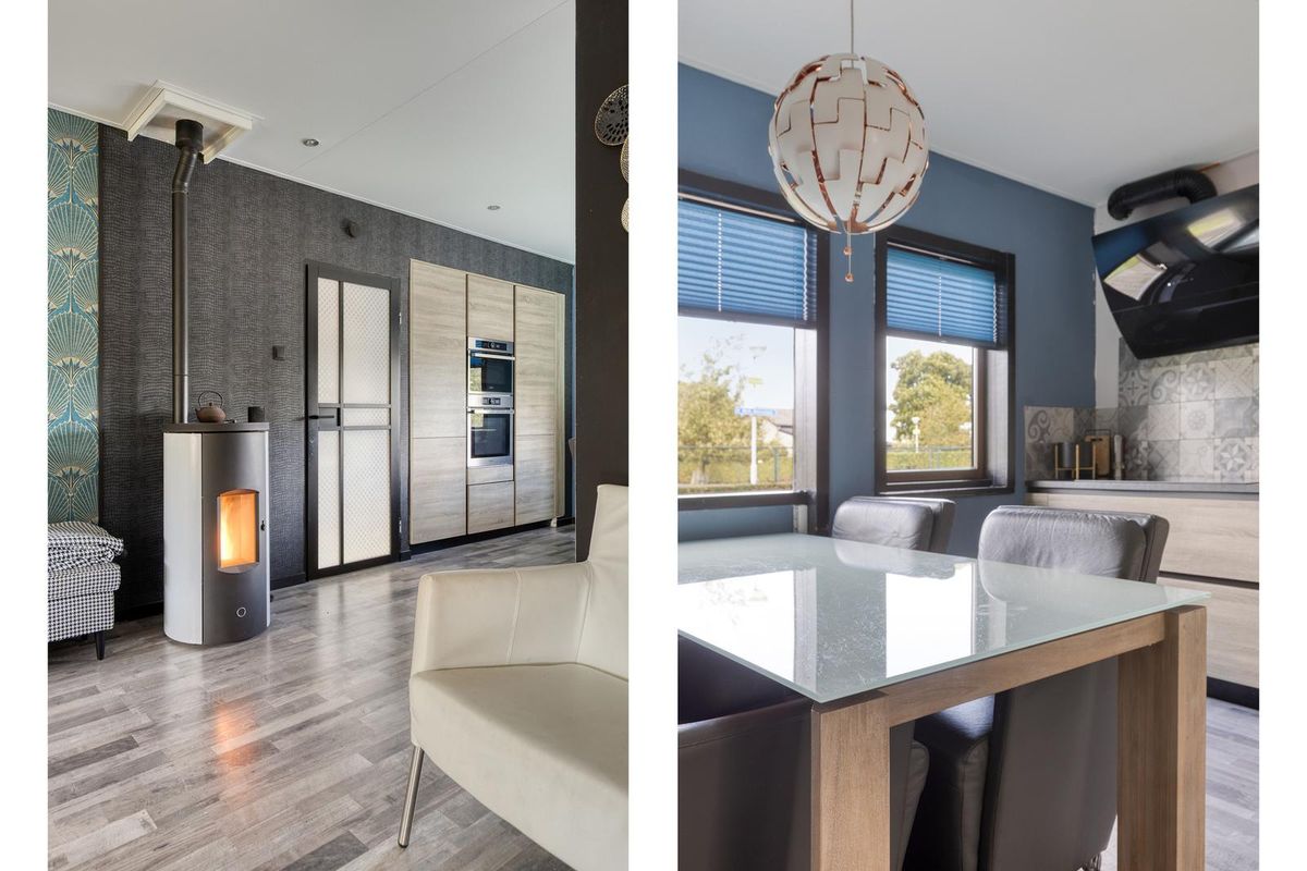 De lichte woonkamer met half open keuken is afgewerkt met een laminaatvloer (met een hardhouten vloer eronder), deels metselwerk, deels behang deels stucwerk als wandafwerking en een spanplafond met spotverlichting. De woonkamer is voorzien van een pelletkachel waar de gehele woning mee wordt verwarmd. Vanuit de woonkamer is de badkamer en werkruimte / praktijkruimte bereikbaar. Via de openslaande deuren in de woonkamer is middels de veranda de achtertuin bereikbaar. Middels de mooie open trap in de woonkamer is de eerste verdieping bereikbaar.
