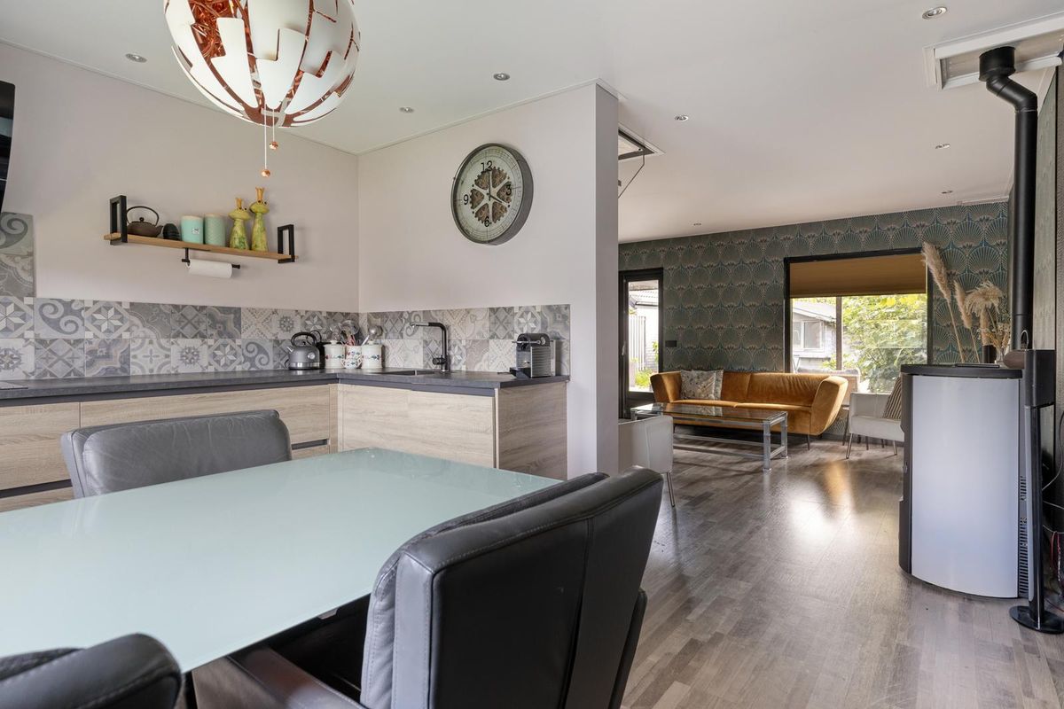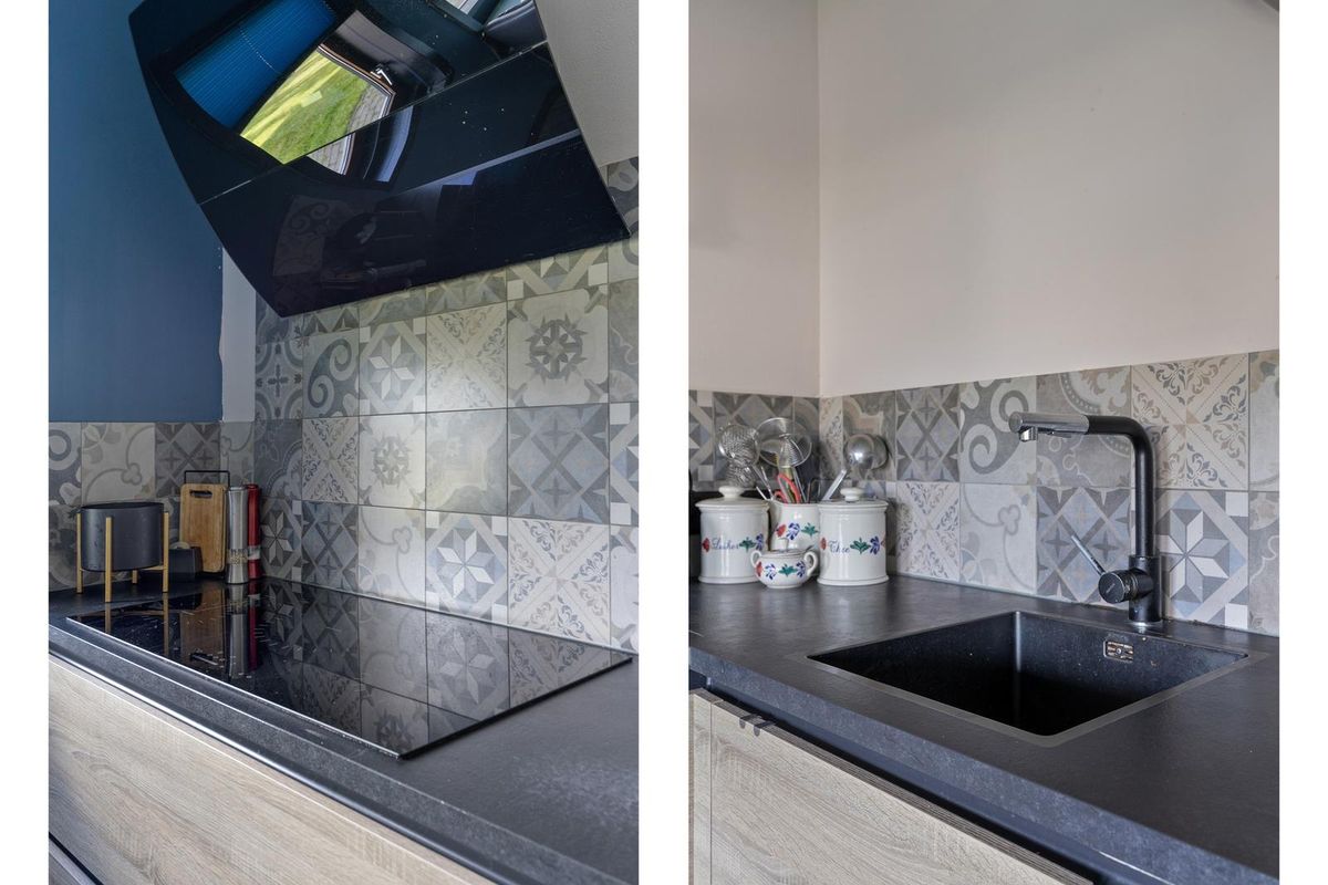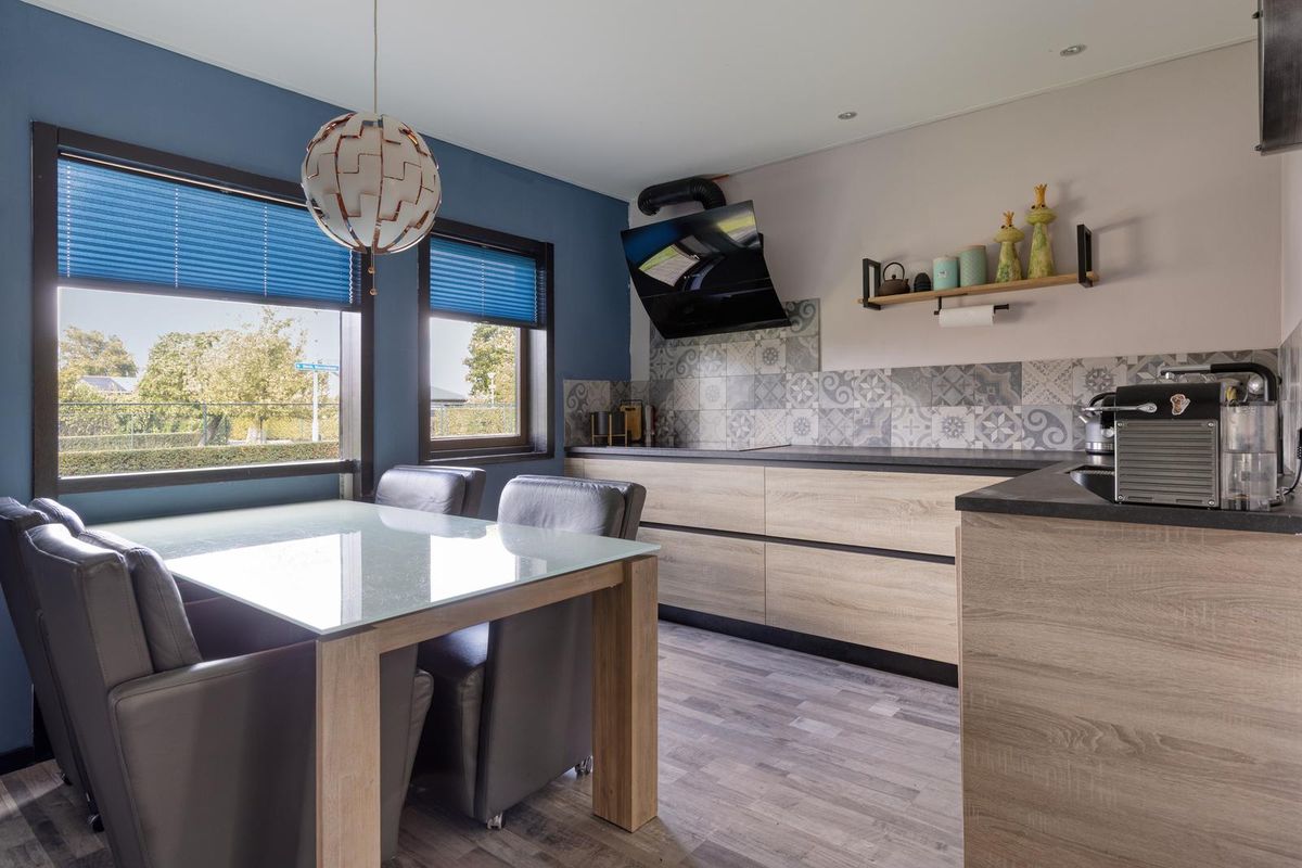 De half open keuken met eethoek is afgewerkt met een kunststof aanrechtblad en voorzien van een inductiekookplaat, een afzuigkap, vaatwasser, elektrische boiler, een grote koelkast en grote vriezer (9-lades), een spoelbak en een dubbele combimagnetron oven (Whirlpool 6th Sense).