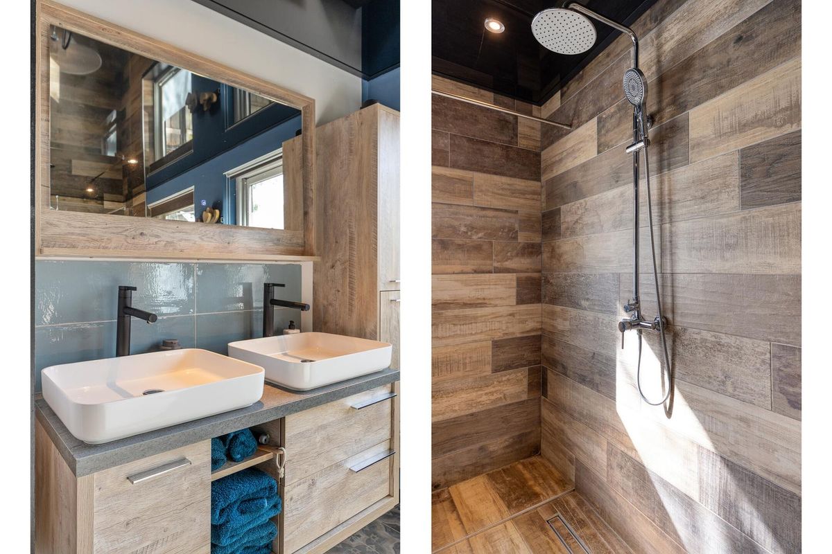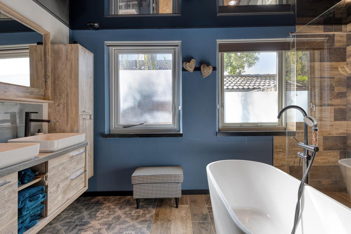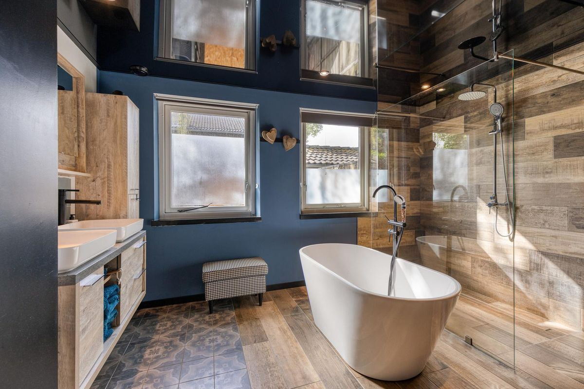 De badkamer is afgewerkt met een tegelvloer, deels tegels deels stucwerk en deels kunststof panelen als wandafwerking en een spanplafond met spotverlichting. De badkamer is voorzien van een grote inloopdouche, ligbad (Aziatisch), een badkamermeubel met twee wastafels, een opbergkast en mechanische ventilatie. Via de badkamer is de slaapkamer op de begane grond bereikbaar.
