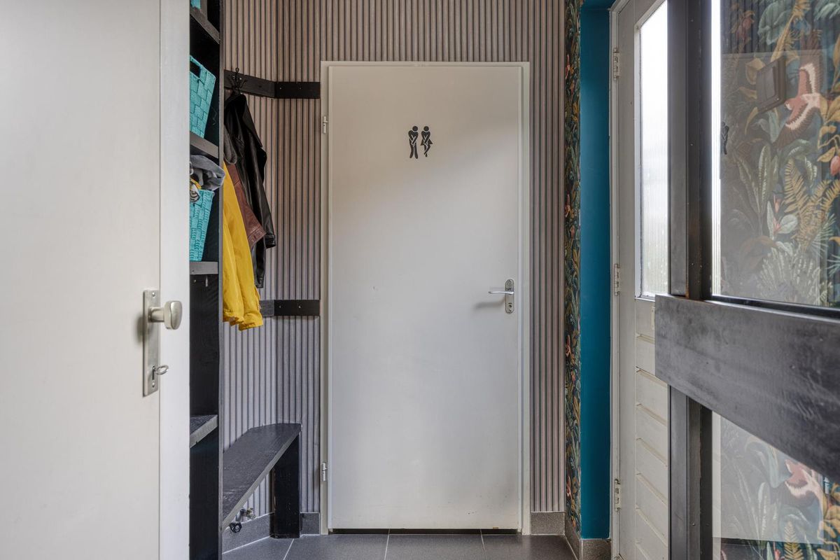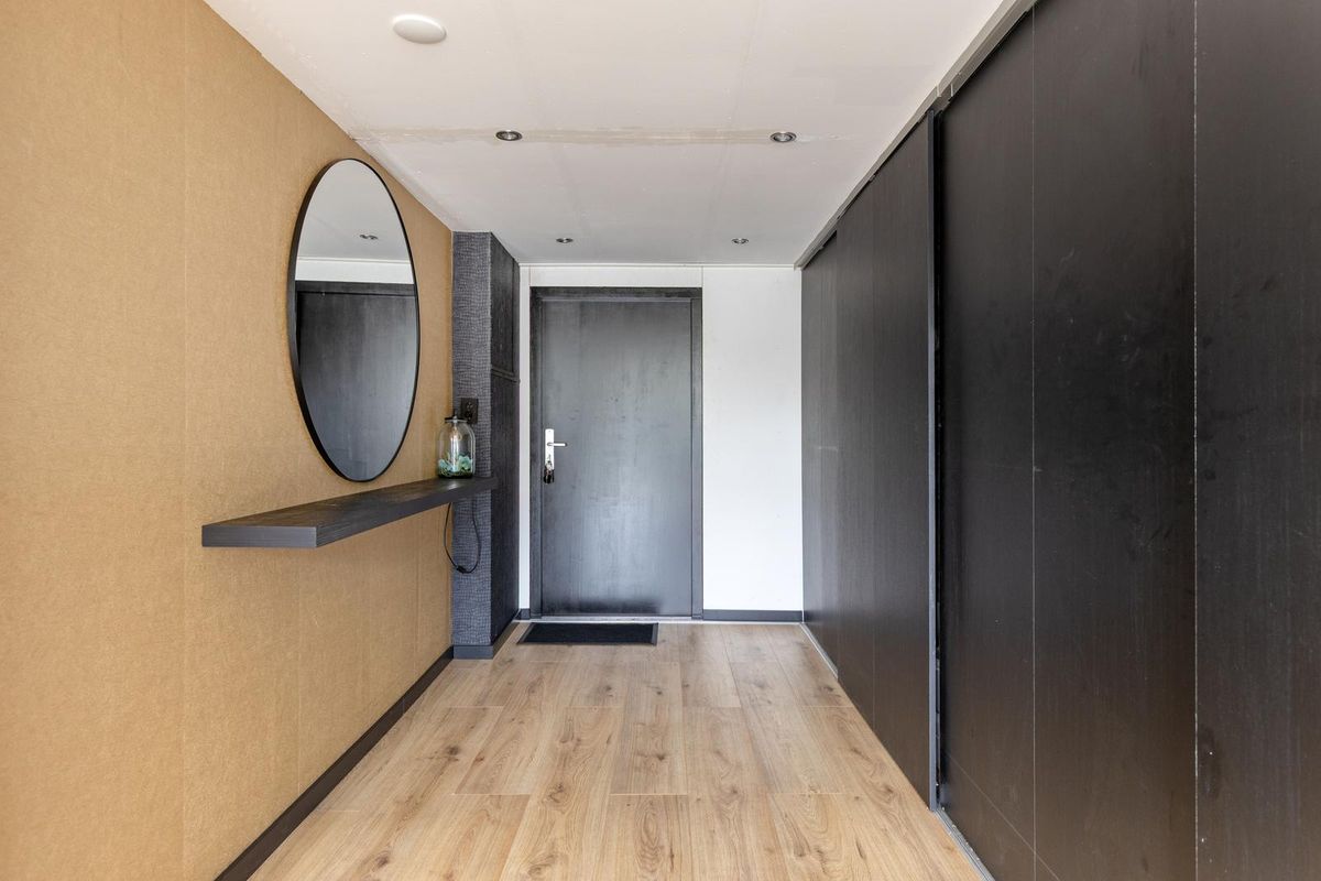 De entree is afgewerkt met een tegelvloer, behang als wandafwerking en een gipsplaten plafond. De entree voorzien van garderobenis geeft toegang tot de meterkast (10x 220 V, waarvan 1x kookgroep, 3x aardlekschakelaars, 1x PV-verdeler, 1x laadpunt auto’s en glasvezelaansluiting), het toilet en de woonkamer.