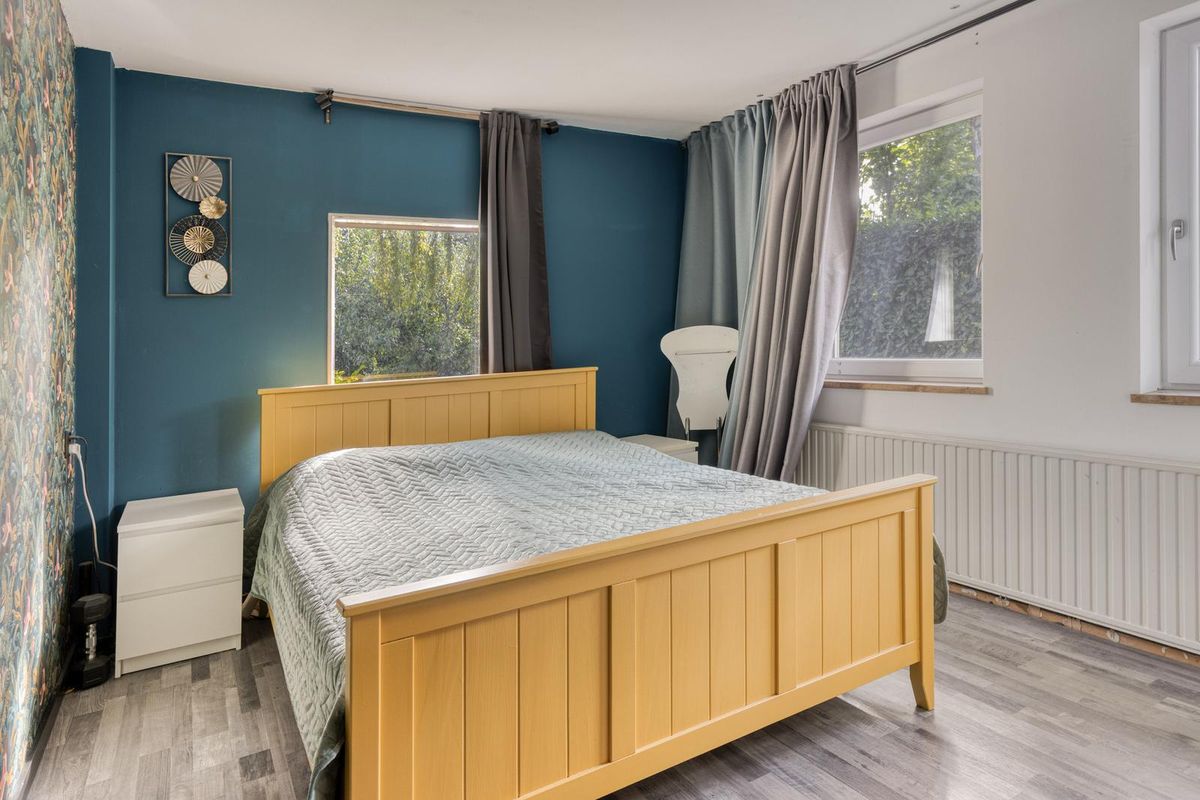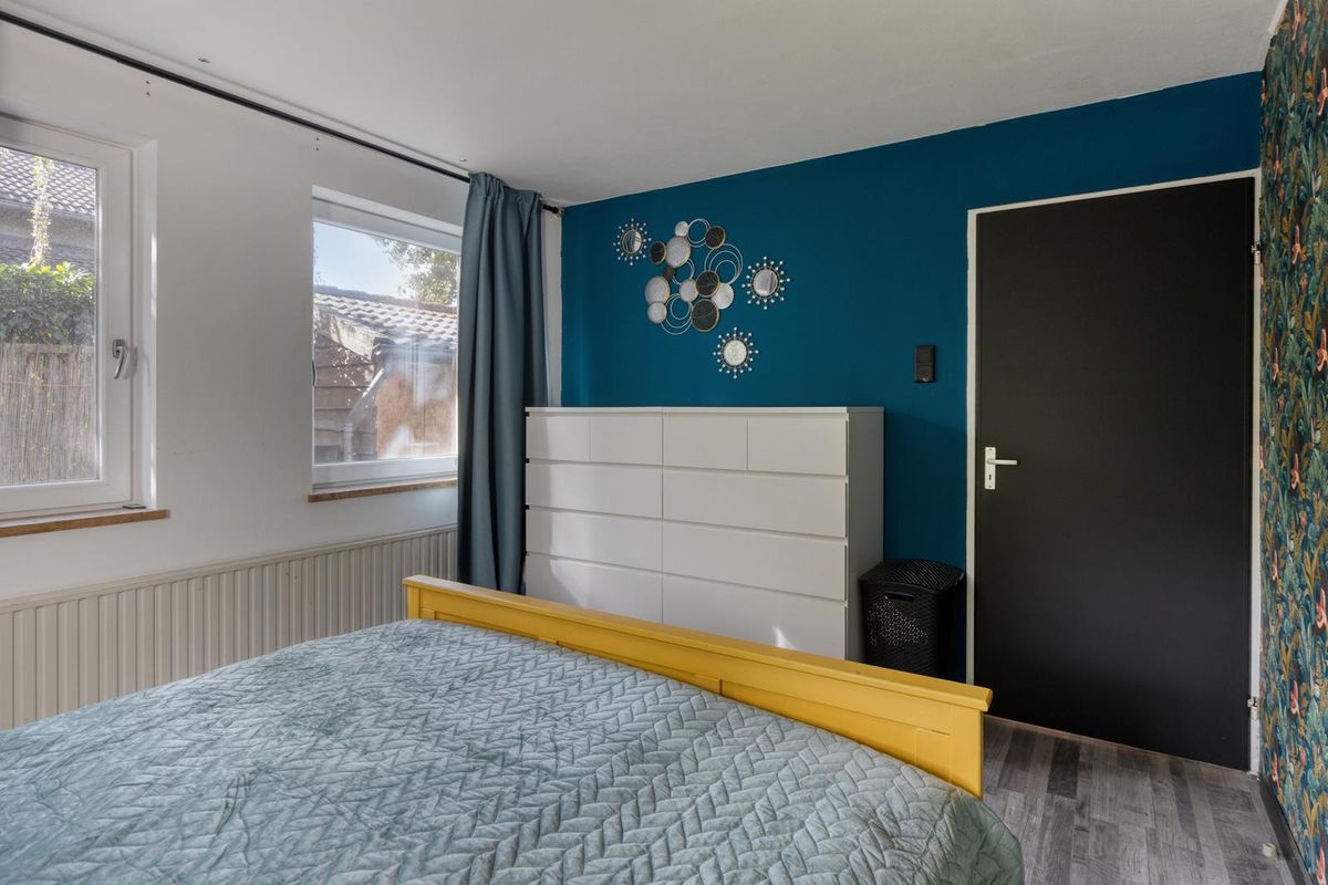 De slaapkamer aan de achterzijde van de woning is afgewerkt met een laminaatvloer, deels behang, deels stucwerk als wandafwerking en een gipsplaten plafond. In de technische ruimte bevindt zich de Bosch 120L boiler. Via de slaapkamer is het toilet bereikbaar.