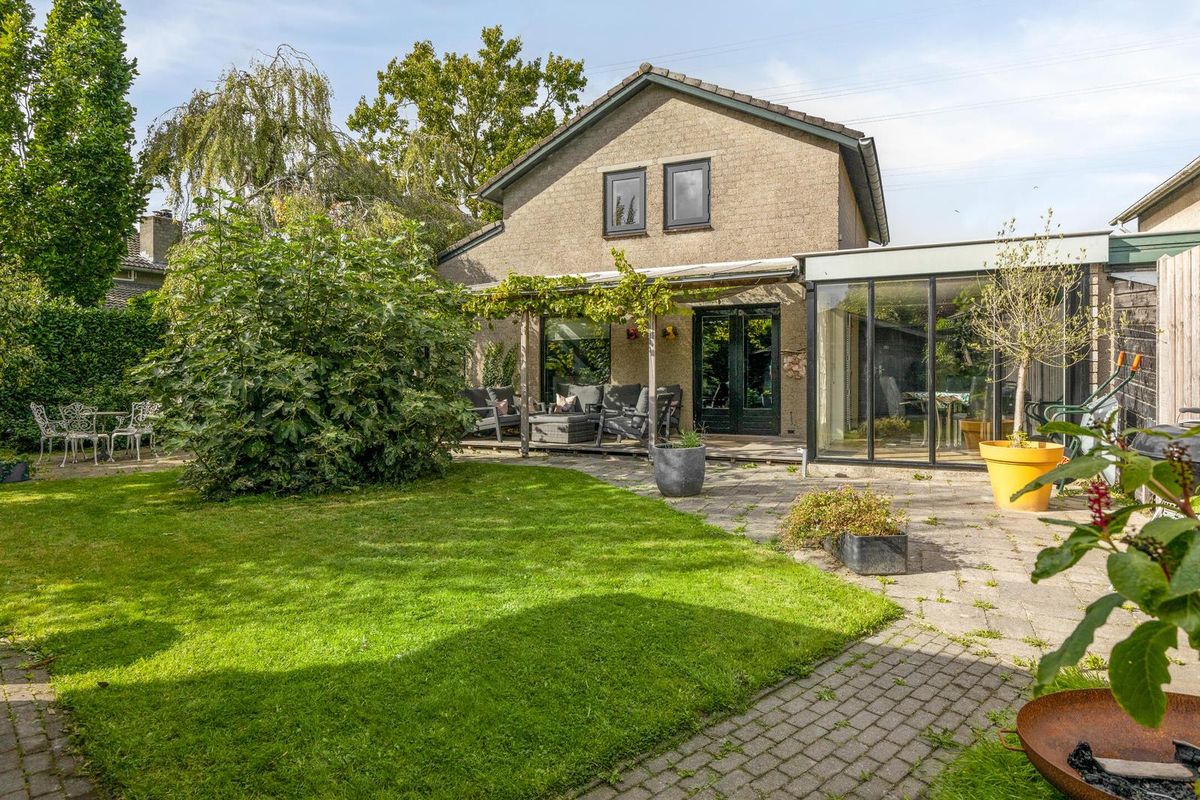 De royale zonnige achtertuin is gelegen op het zuiden en is voorzien van een gazon, bestrating, grint en diverse soorten meerjarige beplanting De achtertuin beschikt over een buitenkraantje, houthok en tuinhuis. Middels de zijkant van de woning is de voortuin bereikbaar. De voortuin is voorzien van een gazon, bestrating en beplanting.