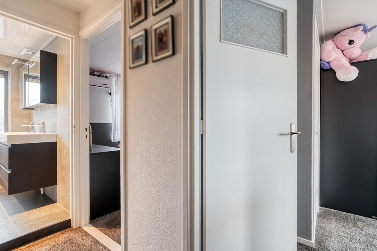 Overloop; 3 slaapkamers van ca. 12, 10 en 5 m²; Prachtige, moderne badkamer voorzien van een inloopdouche, 2e toilet en een dubbele wastafel met badmeubel.