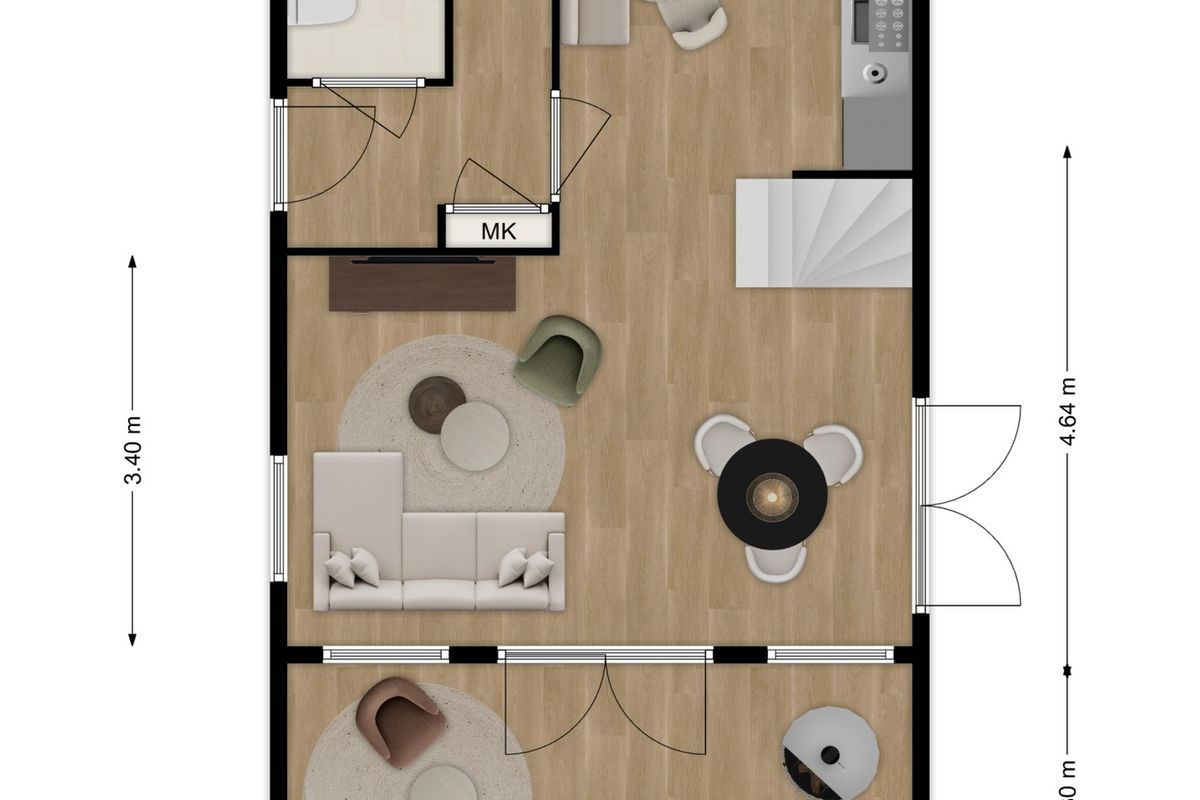 In de ruime woonkamer geniet je dankzij de airco het hele jaar door van een aangename temperatuur, in de zomer zorgt deze voor verkoeling en in de winter voor extra warmte. De openslaande deuren en de vele raampartijen zorgen voor een prachtige lichtinval en creëren een ruimtelijk en uitnodigend gevoel.