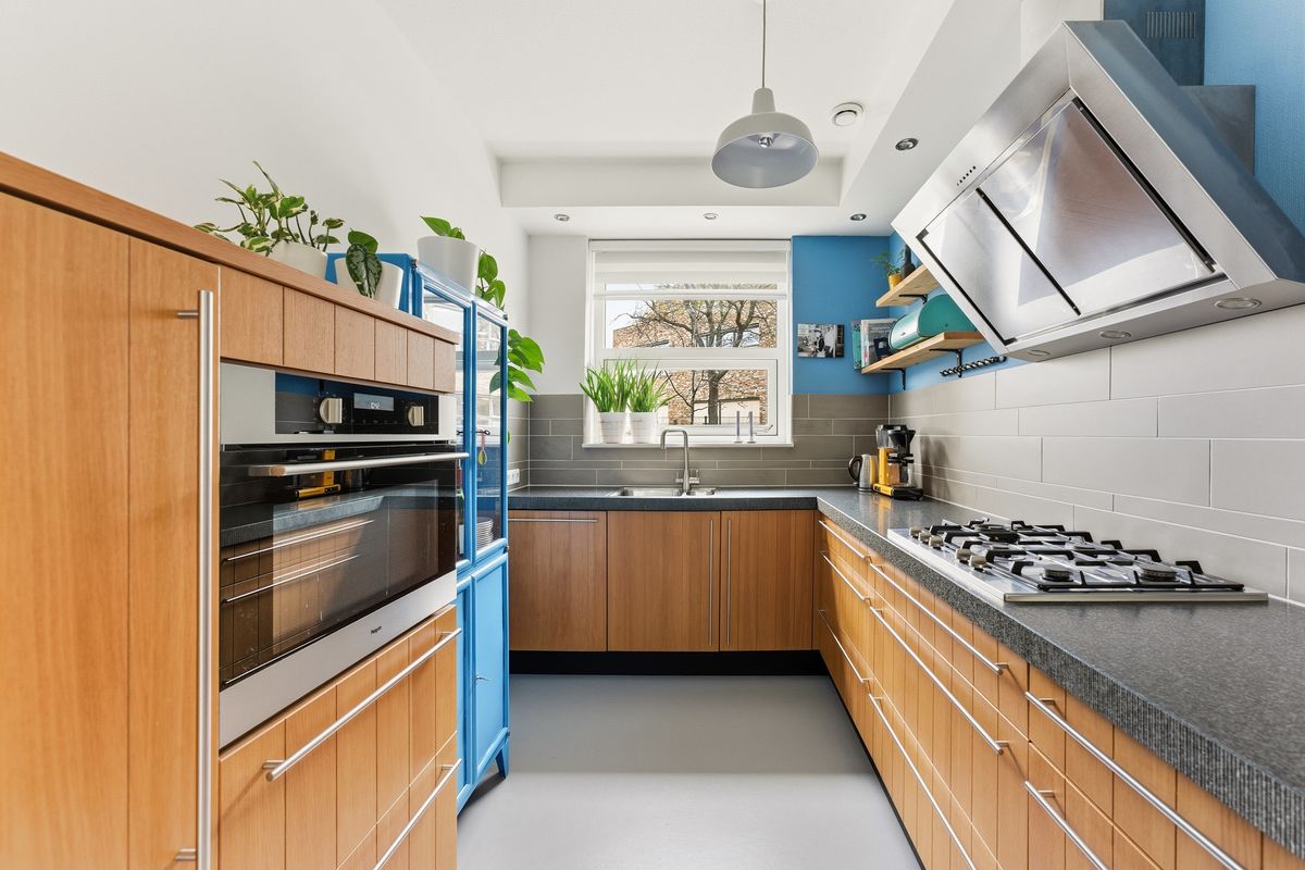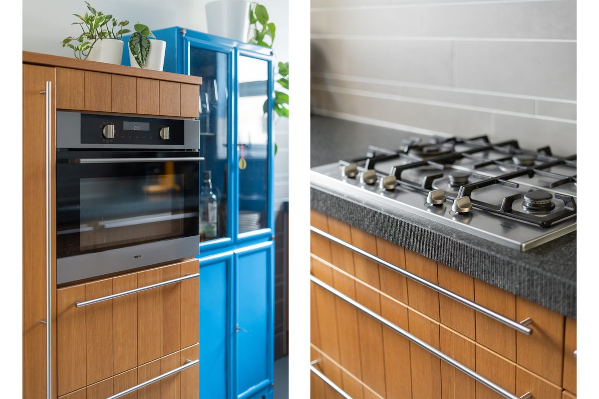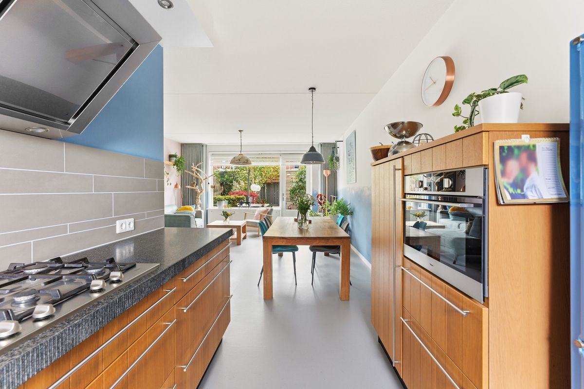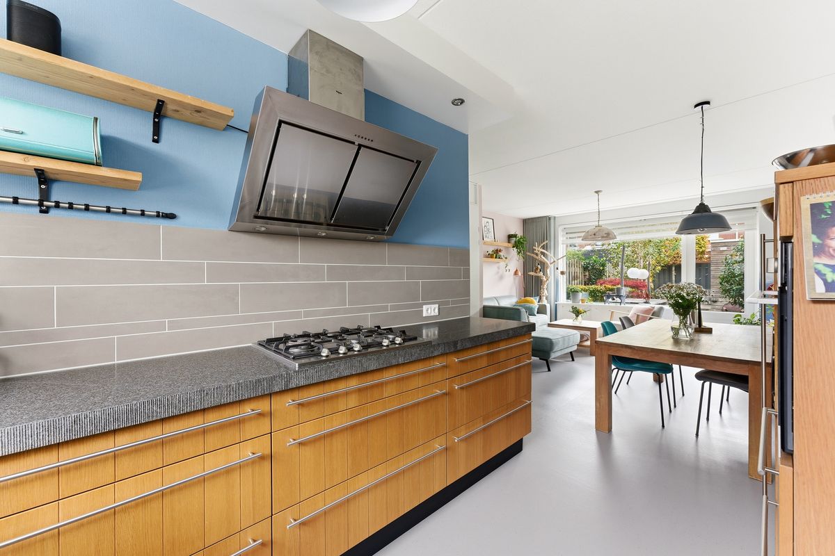 Keuken: Aan de voorzijde bevindt zich de open keuken in L-opstelling met mooi hardstenen aanrechtblad. De keuken is voorzien van diverse inbouwapparatuur, waaronder een oven/magnetron combinatie, afzuigkap met motor (afzuiging naar buiten), koelkast, vaatwassen en een 5-pits gasfornuis. Je hebt hier alles wat je nodig hebt om een heerlijk diner te verzorgen. Daarnaast beschikt de keuken over een handige Le Mans-hoekkast en inbouwspots. De ruimte is afgewerkt met een marmoleum vloer, glasvliesbehang en een spuitwerkplafond.