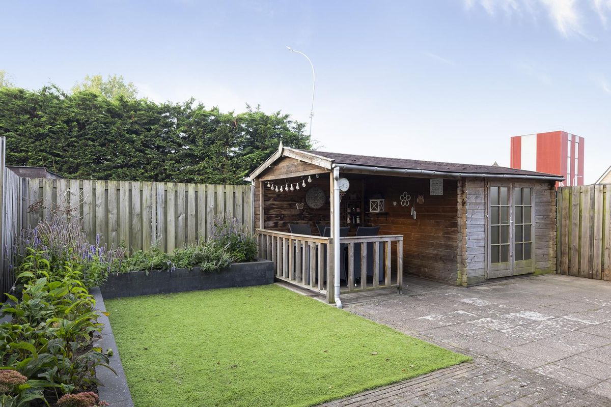 De tuin is een van de absolute pluspunten van deze woning. Dankzij de hoekligging is er een extra brede zij- en achtertuin, fraai aangelegd met groenborders, bestrating en kunstgras. De houten berging met overkapping en achterom maakt het geheel praktisch en compleet.