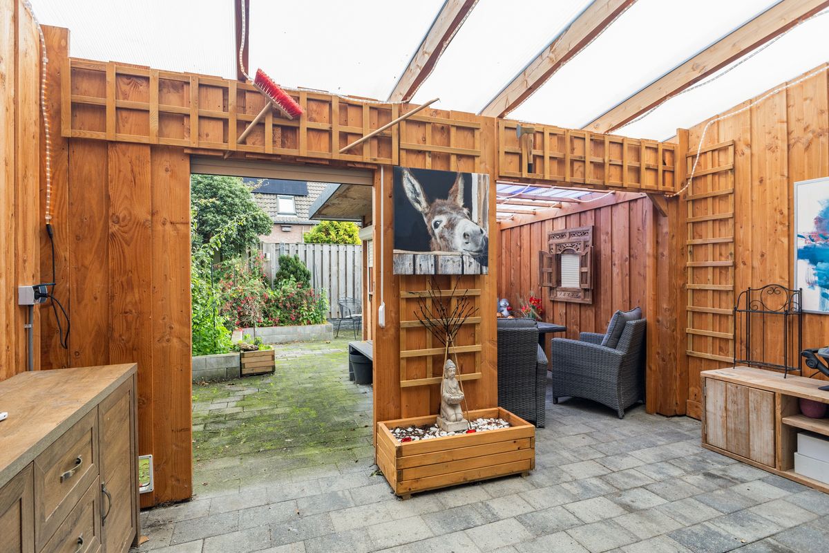 De achtertuin ligt op het oosten en beschikt over een ruime overkapping. Aan de voorzijde van de woning bevindt zich bovendien een praktische stenen berging.