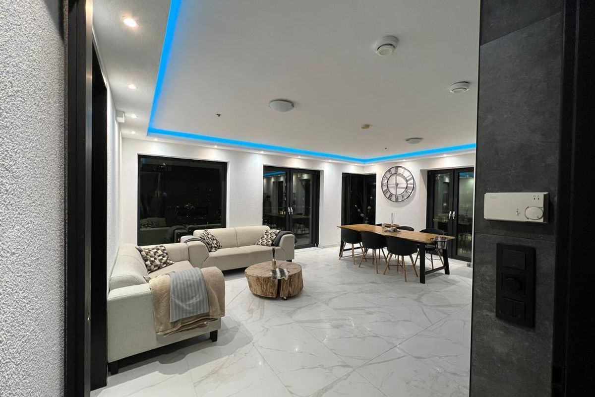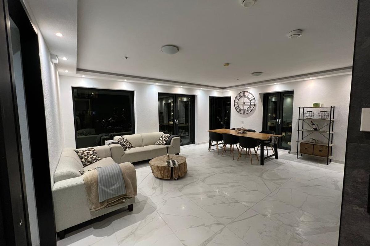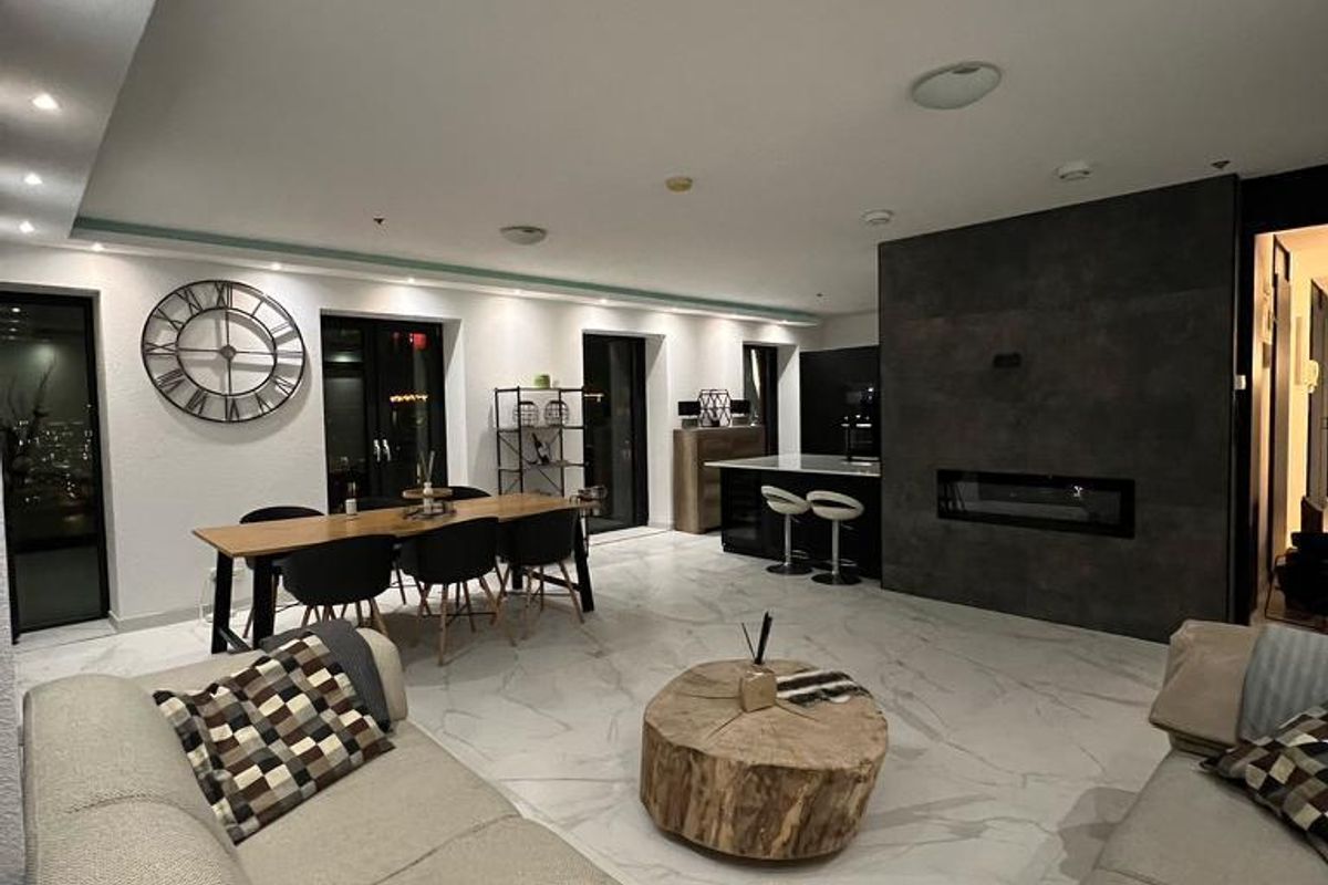 The bright living room with floor-to-ceiling windows and natural stone flooring connects to a luxurious open kitchen with breakfast bar and premium built-in appliances (including a wine cooler, combi oven, induction hob, dishwasher and fridge/freezer). The apartment further features two spacious bedrooms, a newly renovated guest toilet, and a modern bathroom with bathtub, walk-in shower, double sinks, and underfloor heating.
