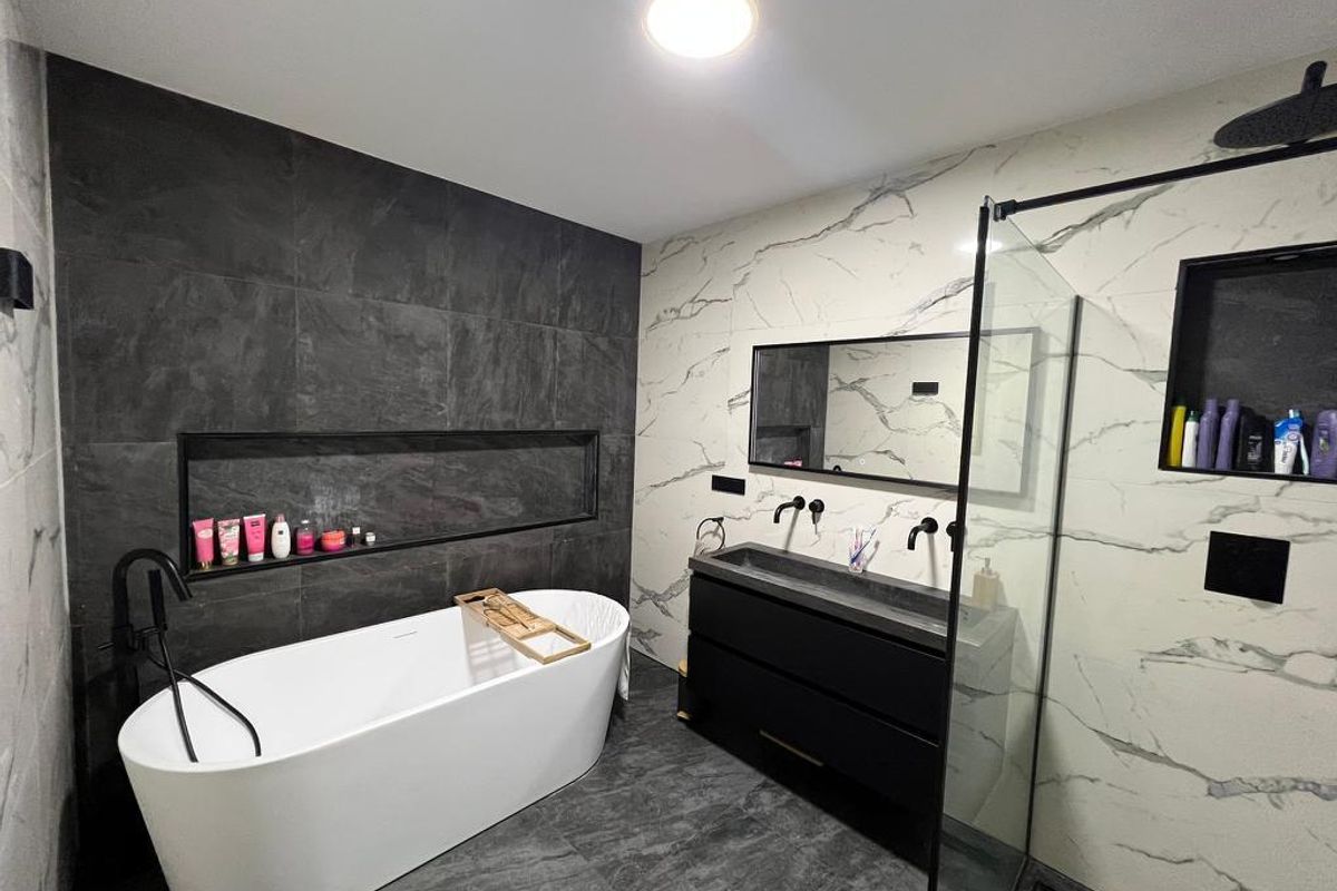 Badkamer: ligbad, inloopdouche, dubbele wastafel, vloerverwarming