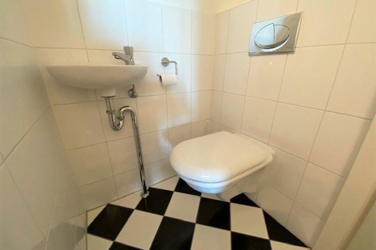 The bathroom is fresh and practical, with a shower, basin, and radiator, while the separate toilet with sink adds extra convenience. An indoor storage room houses a washing machine and dryer, keeping the apartment tidy and organized.