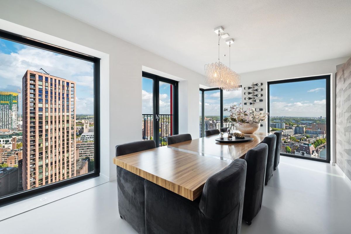 De living is licht en open, omlijst door enorme raampartijen die de stad als een levend schilderij naar binnen halen. Van de Markthal tot de Euromast en de Willemsbrug – hier kijk je nooit twee keer hetzelfde panorama. Aan de andere zijde strekt de eetkamer zich uit, een ruimte waar je dineert boven de skyline. Met uitzicht dat reikt tot de omliggende steden en het groen van de Kralingse Plas.