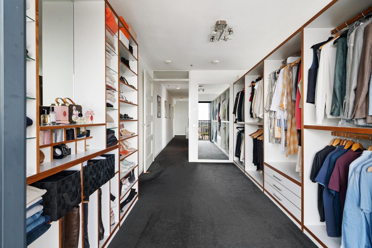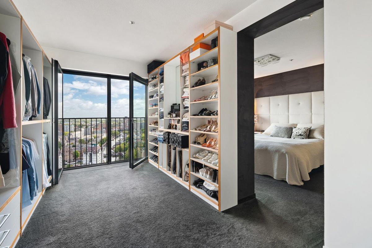 De master bedroom ademt boutique hotel luxe: een chic afgewerkte ruimte met donkere accenten, zacht tapijt en uitzicht dat je elke ochtend en avond weer verrast. Via een imposante XL walk-in closet – ingericht als een high-end boutique – stap je rechtstreeks naar de slaapkamer. De ensuite badkamer is stijlvol in zwart en wit, met inloopdouche, wastafel en een hotelwaardige afwerking.