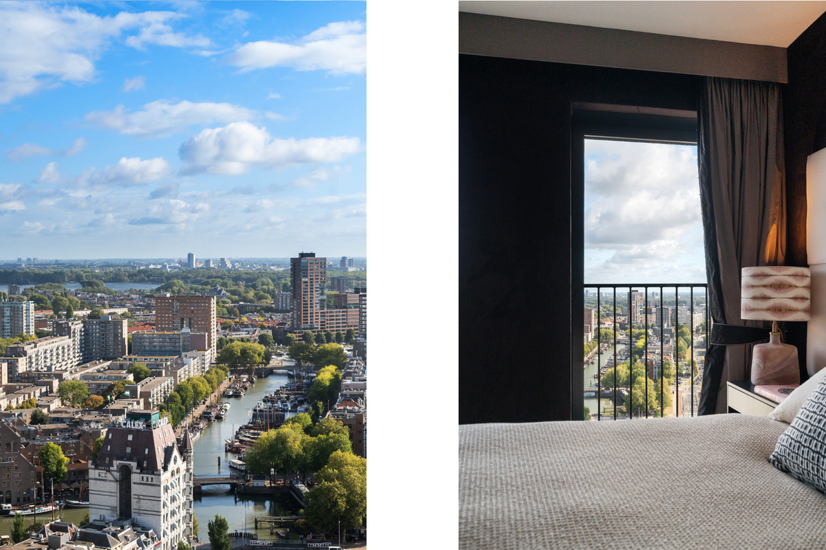 The living area is bright and open, framed by vast windows that draw the city inside like a living painting. From the Markthal to the Euromast and the Willemsbrug—no two panoramas are ever the same. On the opposite side, the dining area stretches out, where you dine above the skyline with views that extend to surrounding cities and the green expanse of Kralingse Plas.