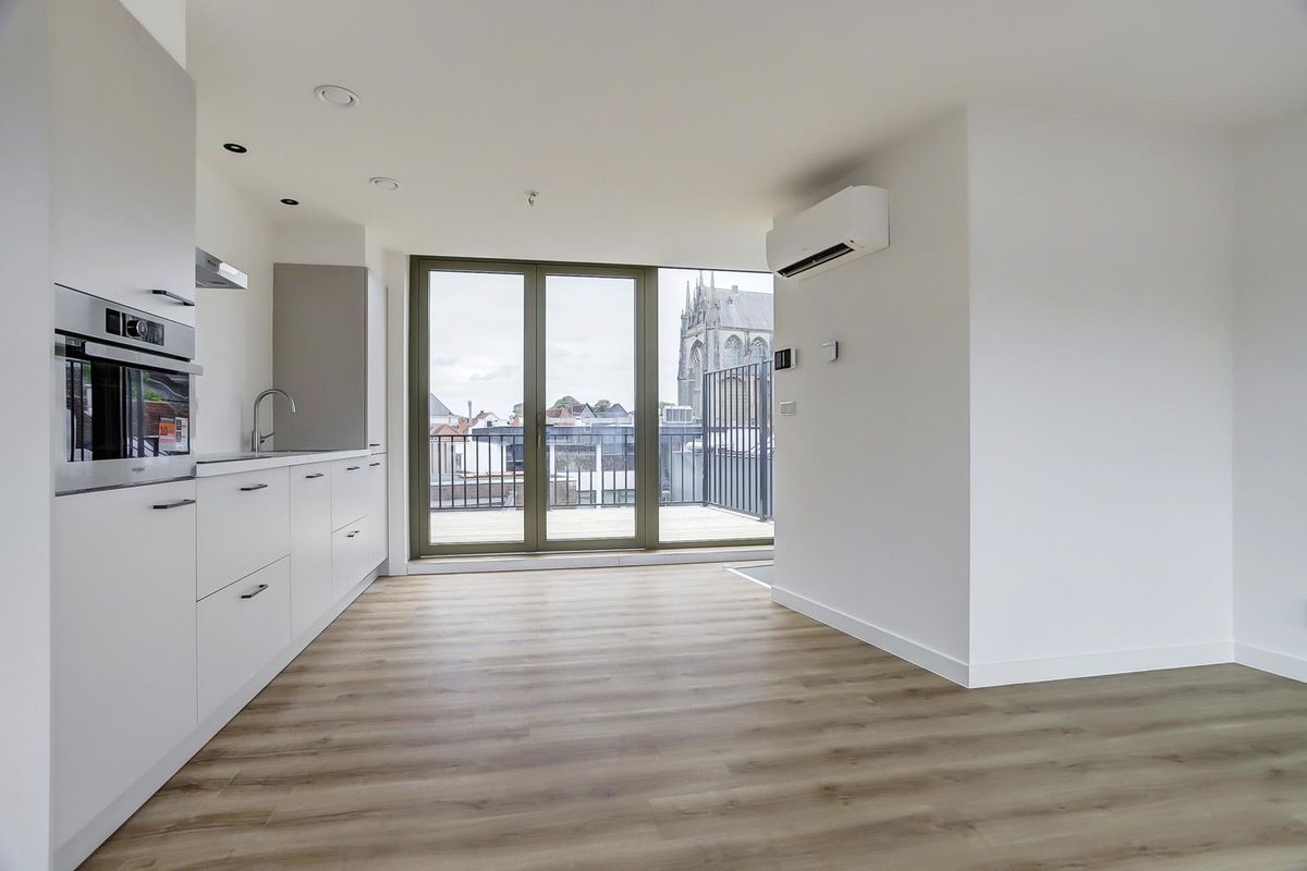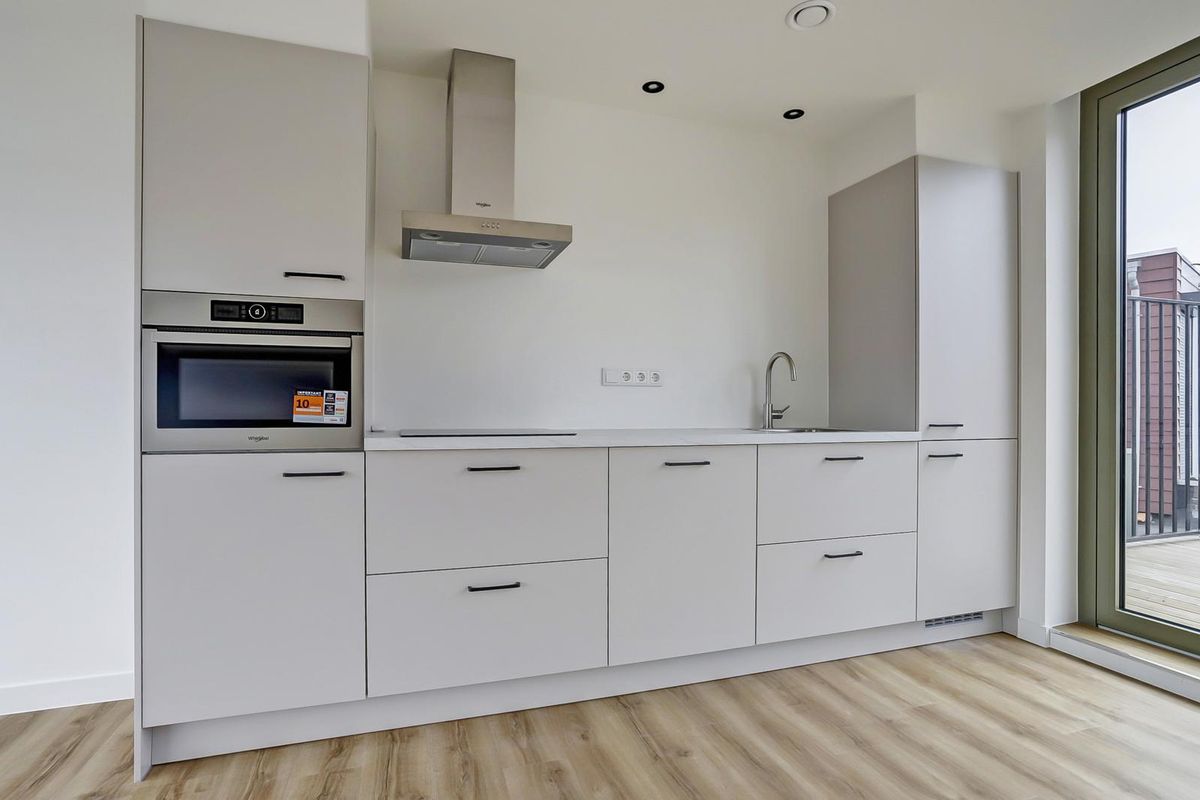 Op de bovenste woonlaag vindt u een royale en lichte woonkamer met een moderne open keuken. De grote ramen zorgen voor een aangename lichtinval en geven toegang tot het ruime dakterras. De keuken is uitgerust met een inductiekookplaat, afzuigkap, combi-oven, koelkast, vriezer en vaatwasser en biedt voldoende kastruimte dankzij de slimme opstelling.