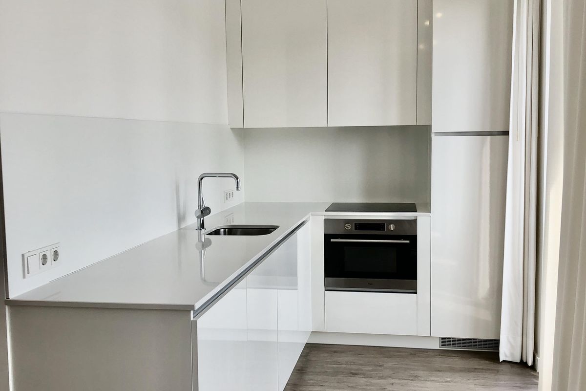 De luxe keuken (ca. 6 m²) is uitgerust met een koelkast, vaatwasser, spoelbak, combimagnetron, afzuigkap en een 4-pits keramische kookplaat. Het appartement beschikt over één slaapkamer (ca. 13 m²) en een balkon (ca. 7 m²).
