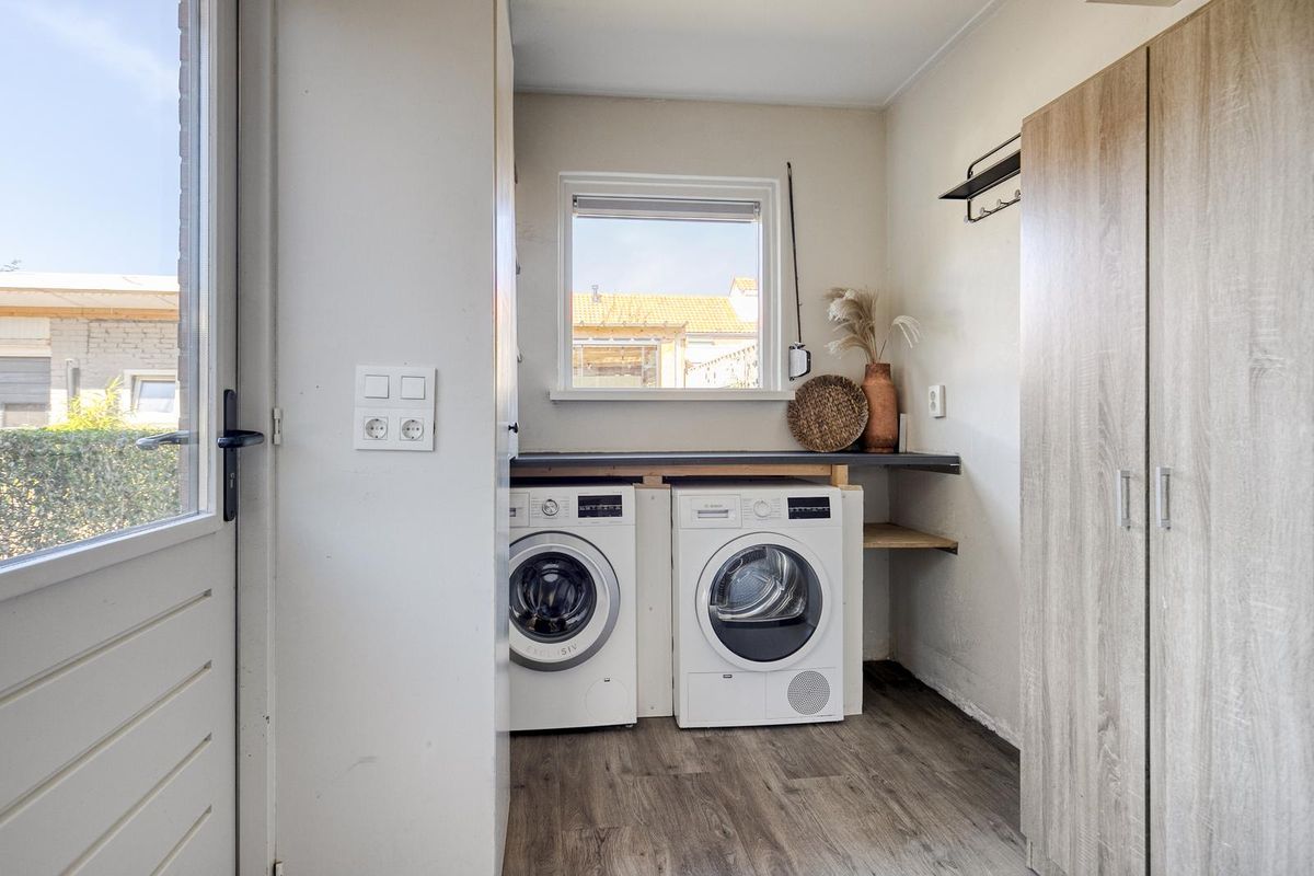 Bij binnenkomst kom je in de hal met de trapopgang, meterkast en het toilet. Vanuit hier stap je de woonkamer in: een lichte doorzonkamer waar de gezellige haard meteen de blik vangt. Hier is genoeg ruimte voor een fijne zithoek en een grote eettafel waar je samen met familie en vrienden lange avonden kunt doorbrengen. De open keuken sluit hier perfect op aan en is uitgevoerd met moderne inbouwapparatuur, waardoor koken een plezier wordt. Achter de keuken ligt de praktische bijkeuken met witgoedaansluitingen en een deur naar de achtertuin.