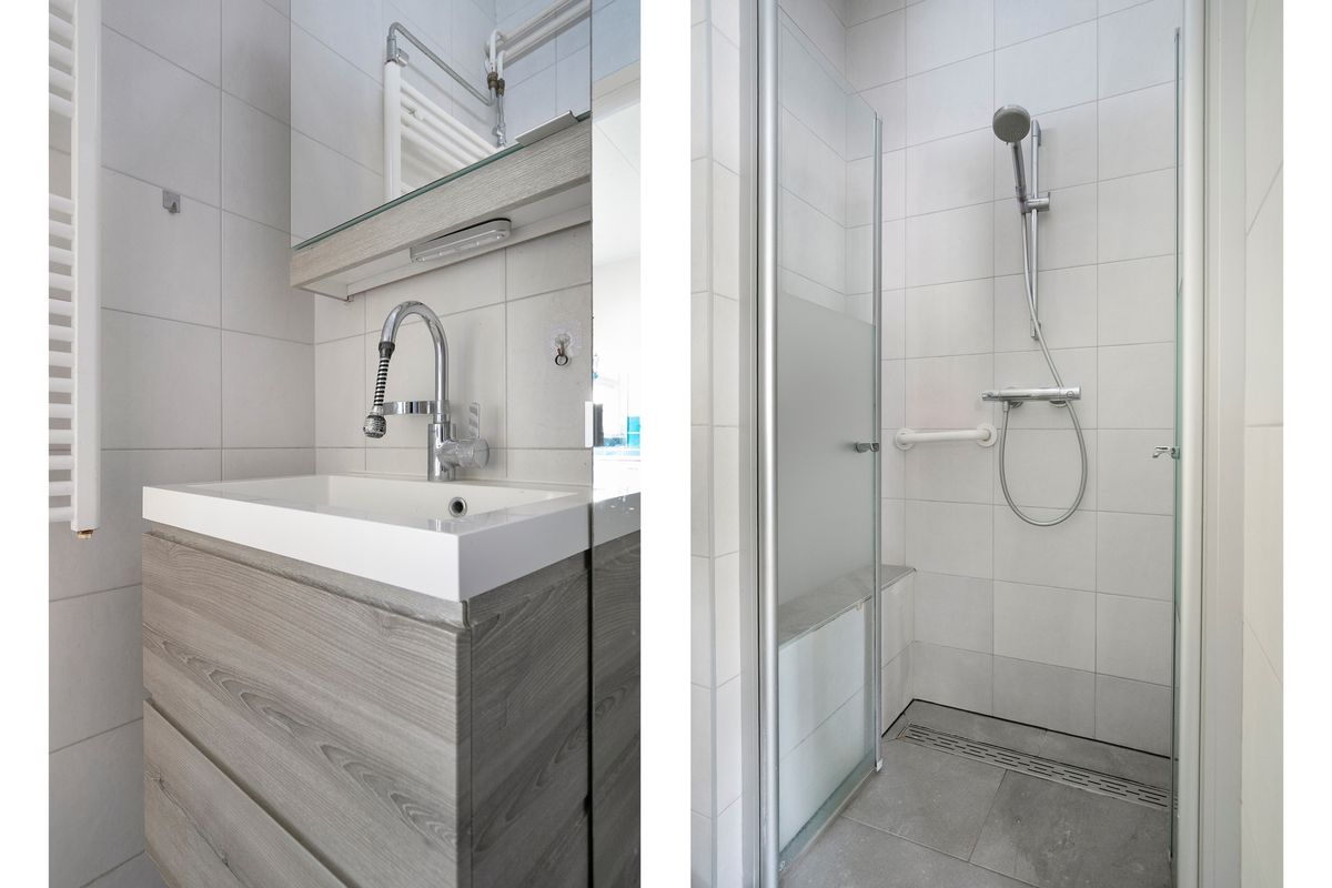 Aan de achterzijde van het huis is de bijkeuken welke toegang geeft tot het toilet en tot de badkamer. De toiletruimte is ingericht met een staand toilet en een fonteintje. De badkamer is ingericht met een douche en een wastafelmeubel.