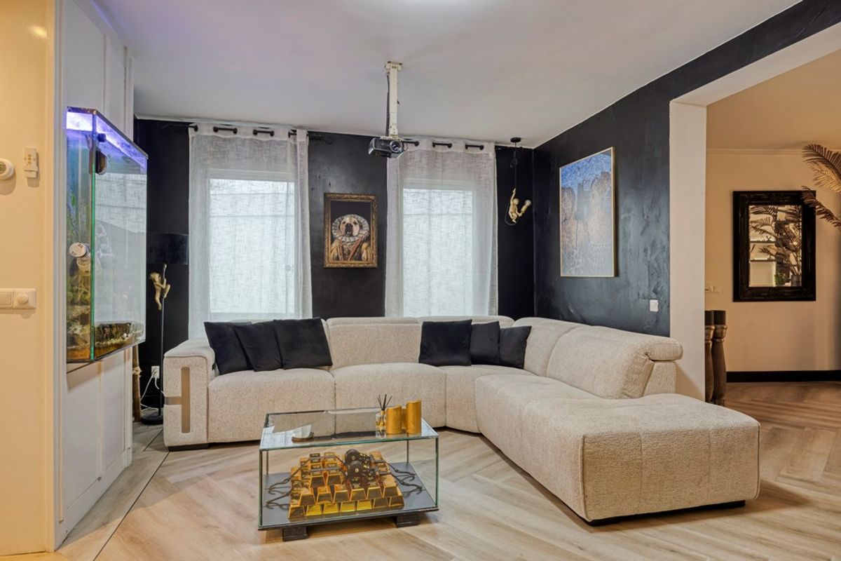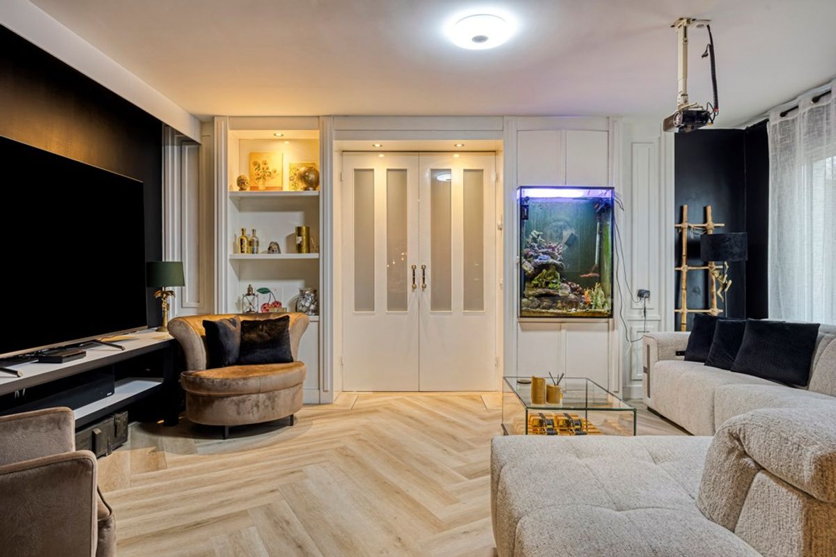 • Woonkamer: Een sfeervol zitgedeelte is door de dubbel openslaande deuren vanuit de werkkamer toegankelijk. Vanuit hier zie je hoe royaal de aanbouw is met leefkeuken. Vloer is afgewerkt met een exclusieve visgraatmotief pvc-vloer met zwarte bies langs de muren, welke doorloopt in de keuken en zij-entree en wanden en plafonds zijn strak afgewerkt.