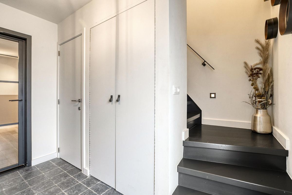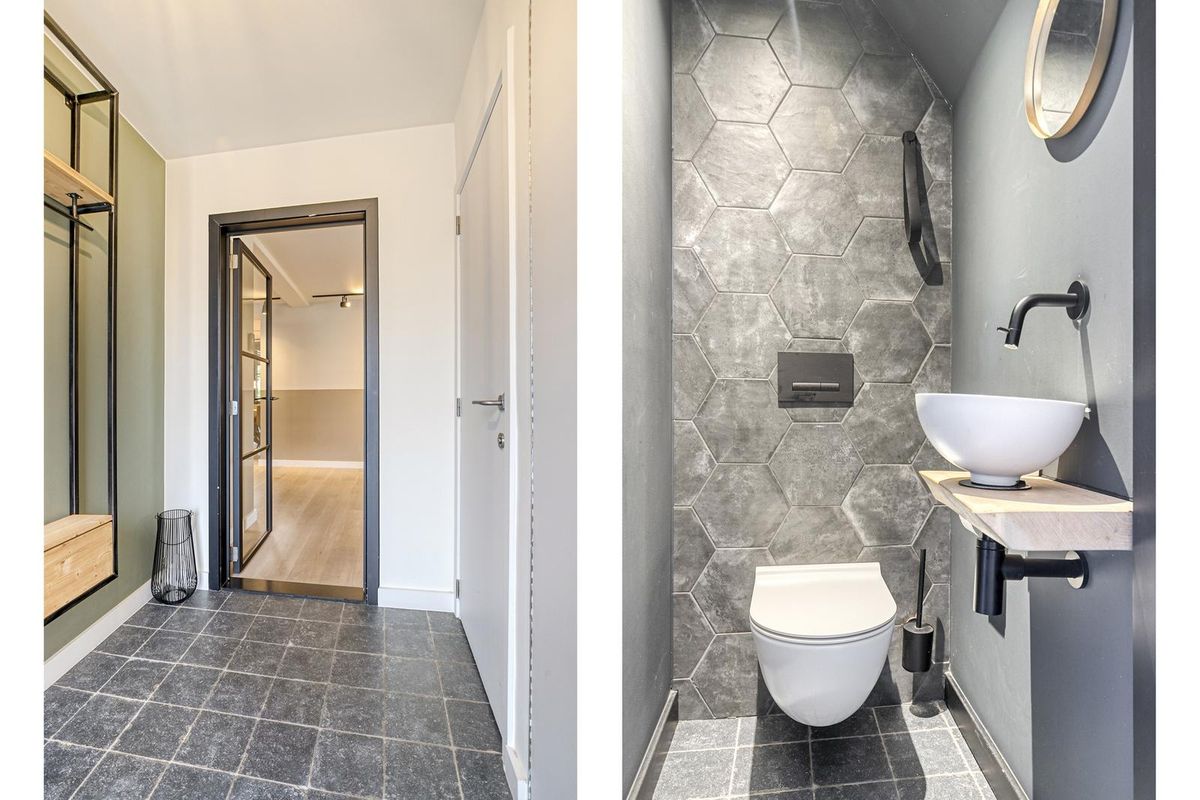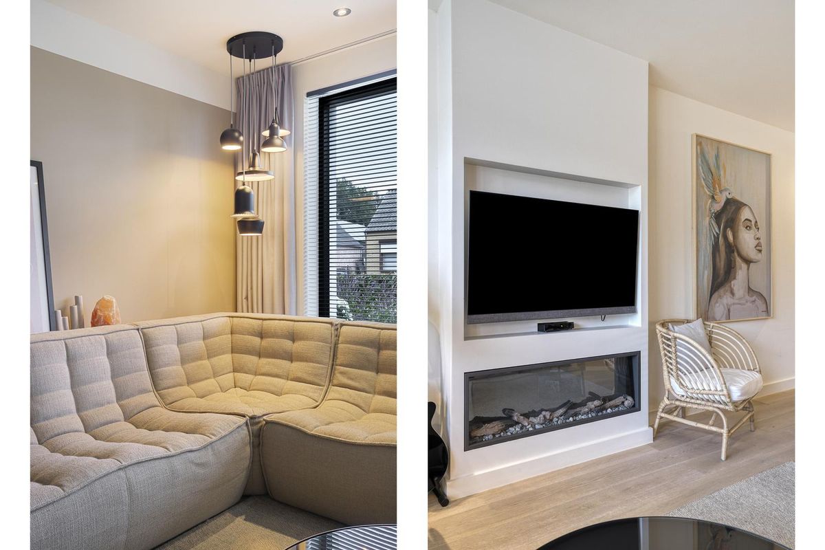 Al in de hal proef je de zorg en aandacht waarmee dit huis is afgewerkt. De stijlvolle tegelvloer, het toilet zonder drempel en de praktische inbouwkasten zorgen voor een strakke eerste indruk. Via de elegante glazen deur stap je de woonkamer binnen. Grote ramen van vloer tot plafond zorgen voor een ruimtelijk gevoel, terwijl de white wash eikenvloer en de sfeervolle elektrische haard warmte en gezelligheid brengen. Overal zorgen subtiele inbouwspots voor de juiste sfeer op elk moment van de dag.