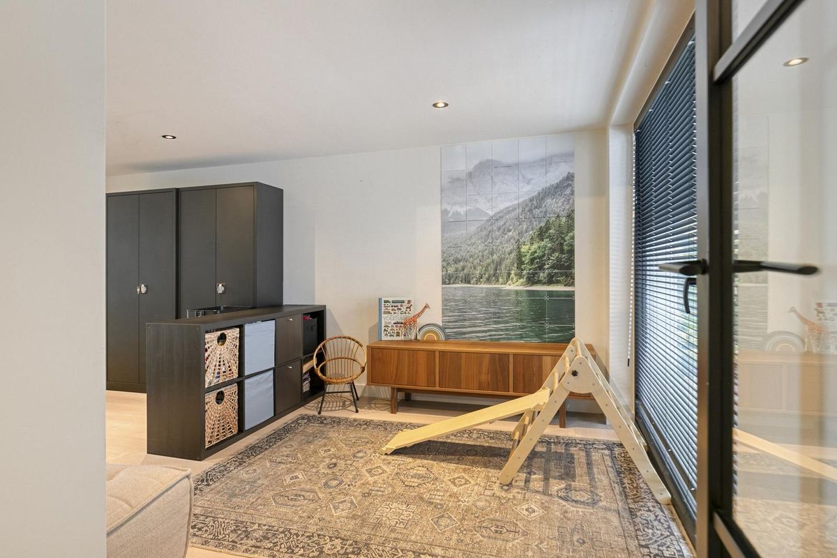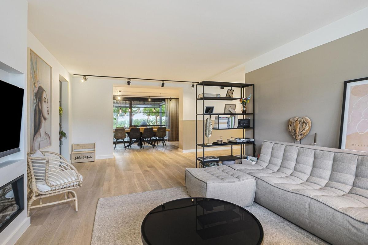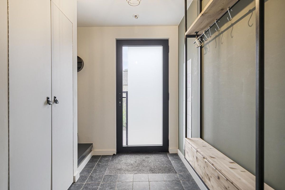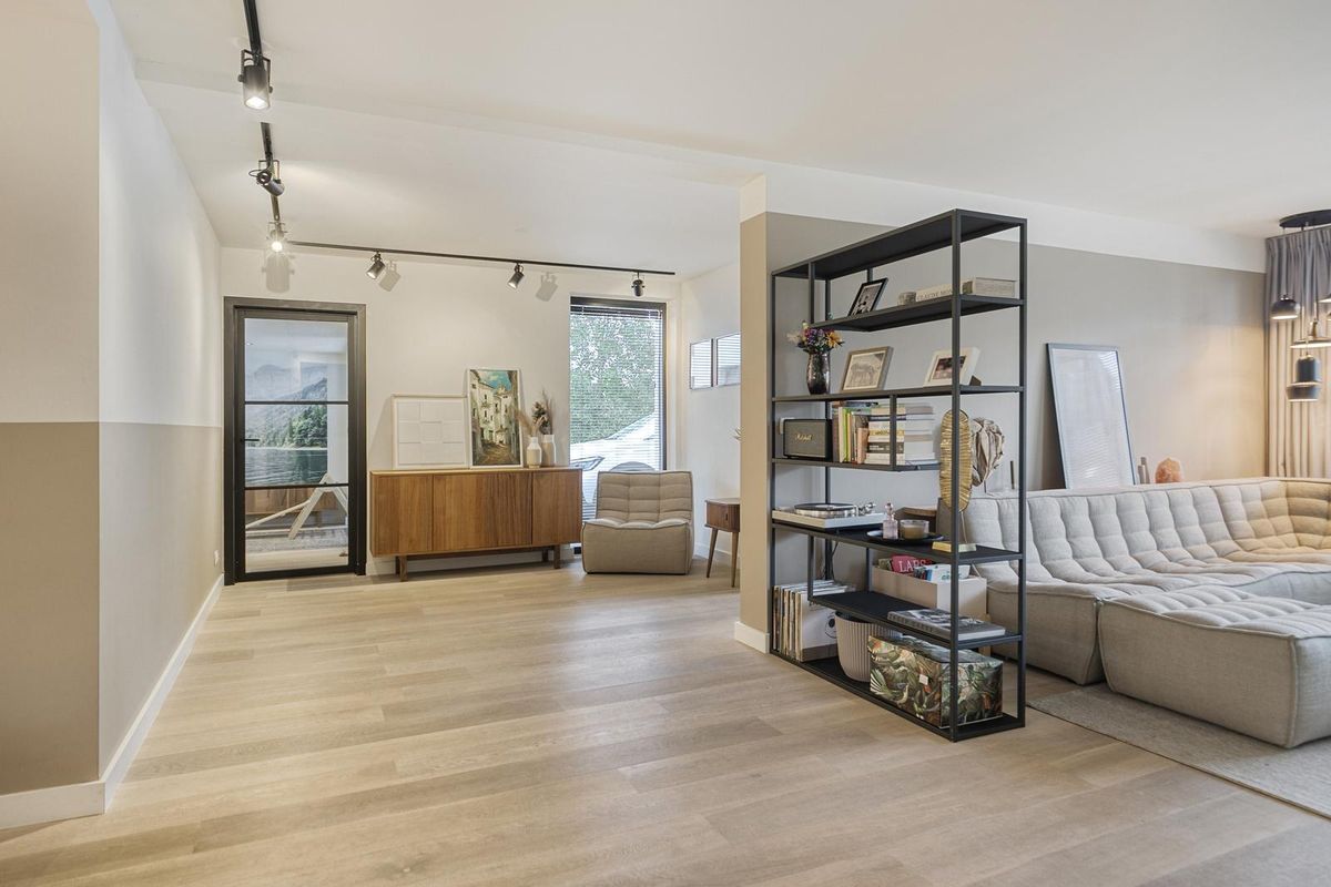 Al in de hal proef je de zorg en aandacht waarmee dit huis is afgewerkt. De stijlvolle tegelvloer, het toilet zonder drempel en de praktische inbouwkasten zorgen voor een strakke eerste indruk. Via de elegante glazen deur stap je de woonkamer binnen. Grote ramen van vloer tot plafond zorgen voor een ruimtelijk gevoel, terwijl de white wash eikenvloer en de sfeervolle elektrische haard warmte en gezelligheid brengen. Overal zorgen subtiele inbouwspots voor de juiste sfeer op elk moment van de dag.