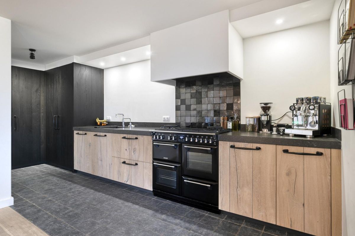 De eetkamer en keuken vormen samen het hart van de woning. Dankzij de grote schuifpui vloeien binnen en buiten hier naadloos samen. De keuken is royaal opgezet en voorzien van alles wat je van een moderne leefkeuken mag verwachten: een indrukwekkend 6-pits fornuis van Stoves, een quooker, vaatwasser en een royale koelkast. De bijkeuken – strak afgewerkt met inbouwkasten – biedt extra gemak en plek voor onder andere de wasapparatuur.