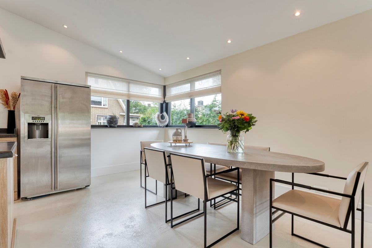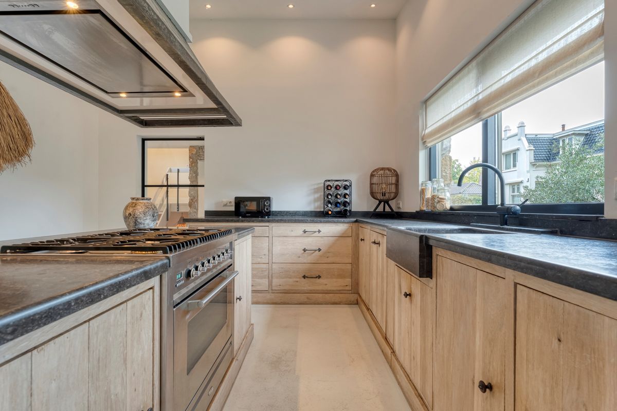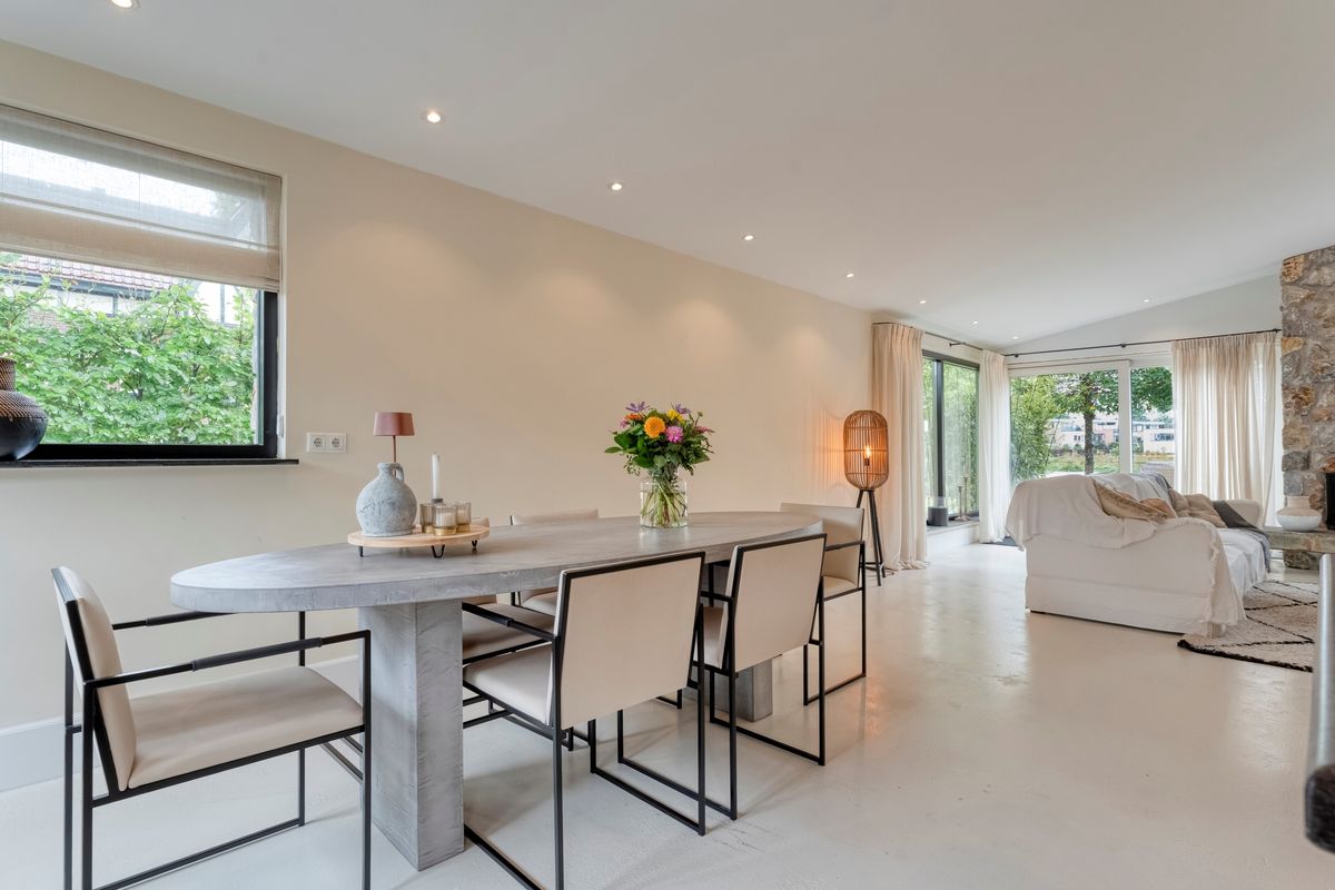 Bij binnenkomst vind je de entree met meterkast en de trapopgang naar zowel de bovenverdieping als het souterrain. De royale en lichte woonkamer biedt een prachtig uitzicht over de Vecht en geeft via de schuifpui directe toegang tot de ruime achtertuin. De massief houten keuken is een echte eyecatcher: uitgerust met een kookeiland met natuurstenen werkblad en voorzien van inbouwapparatuur zoals een gaskookplaat, afzuigkap, vaatwasser, oven en koelkast. Zowel de woonkamer als de keuken zijn voorzien van vloerverwarming, strak gestuct wanden en sfeervol afgewerkt met ingebouwde spots.