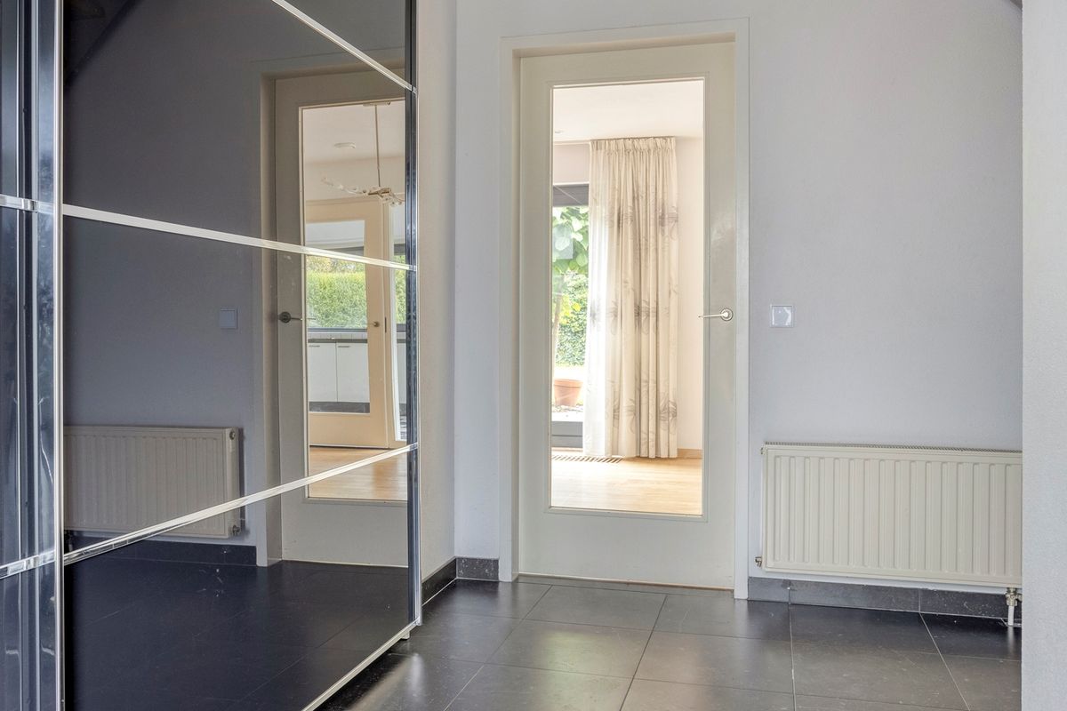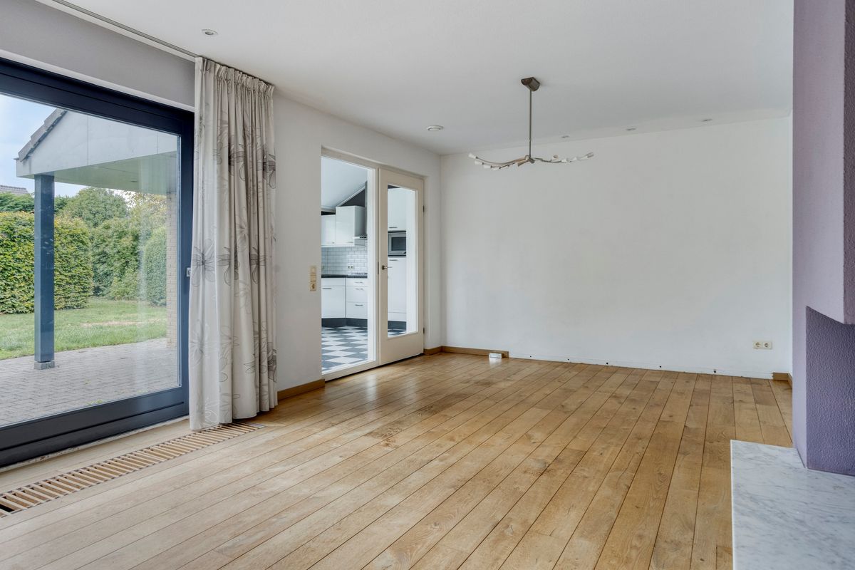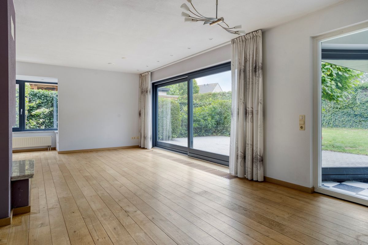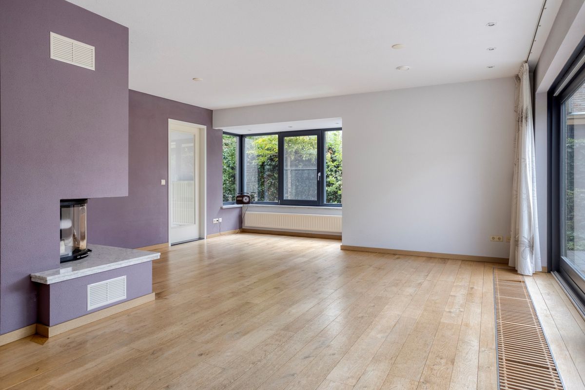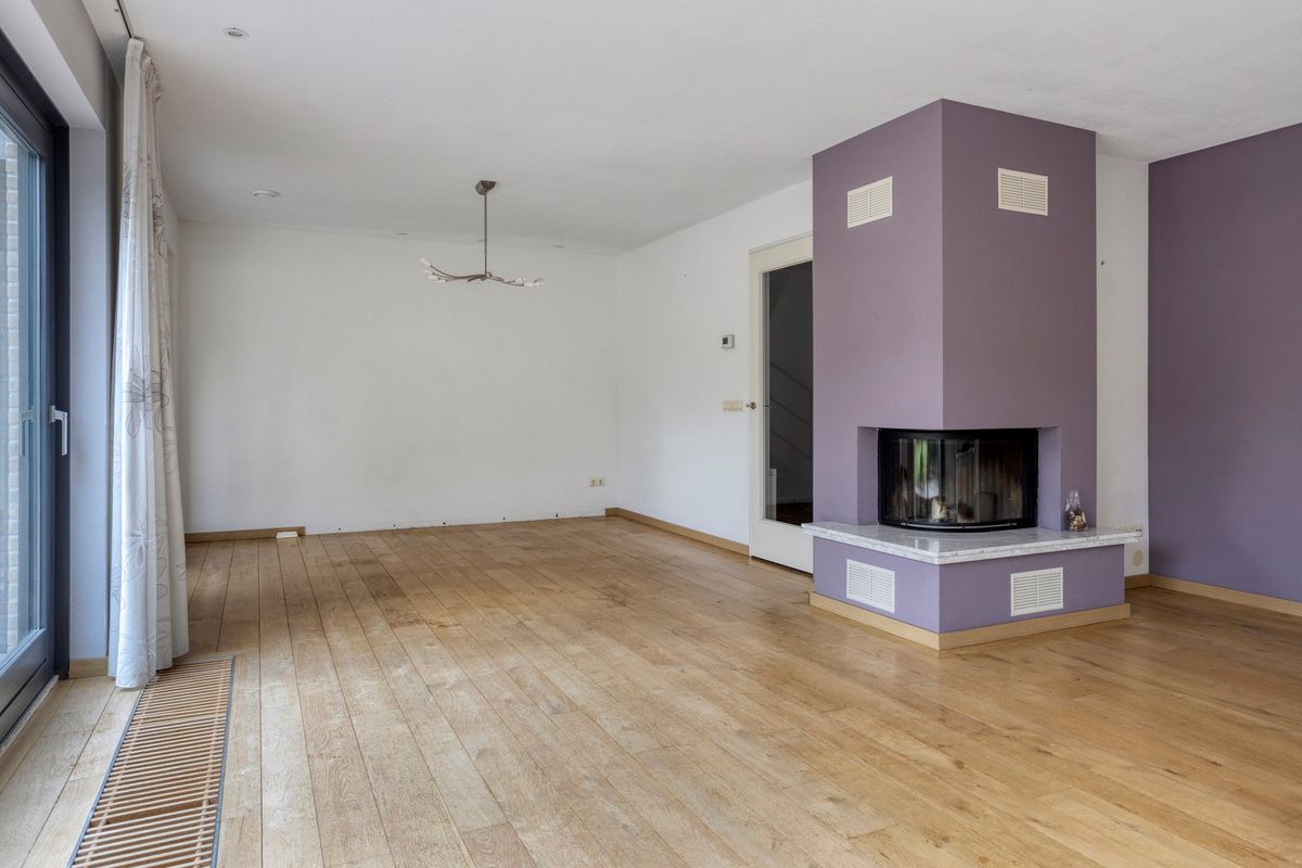 U komt binnen in de ruime hal met toilet, meterkast, garderobekast en de trap naar de eerste verdieping. De ruime L-vormige woonkamer (40 m²) met erker is gericht op de tuin en is voorzien van een eiken parketvloer en plafondspots. In de woonkamer is een moderne open haard.