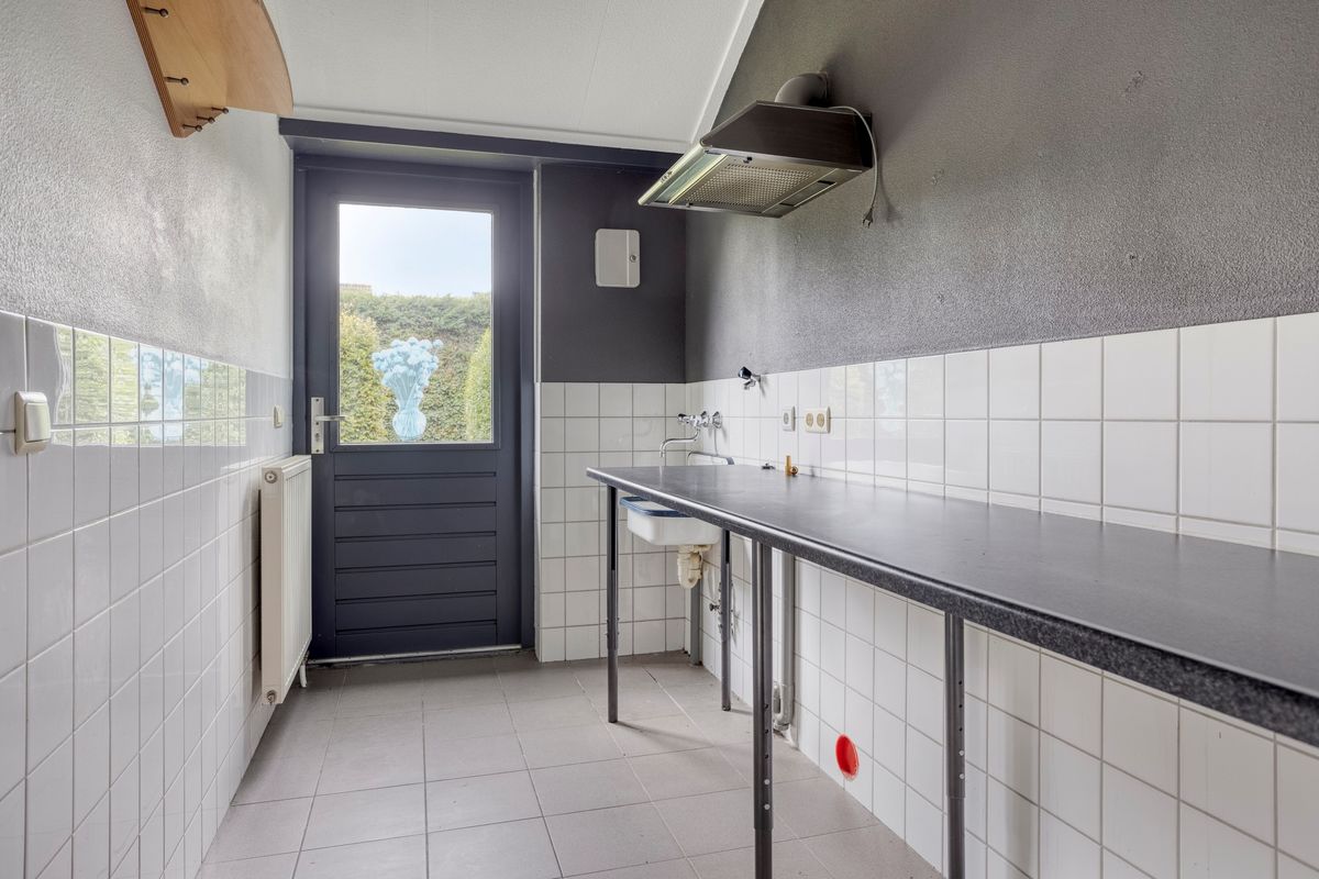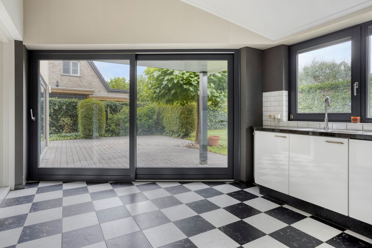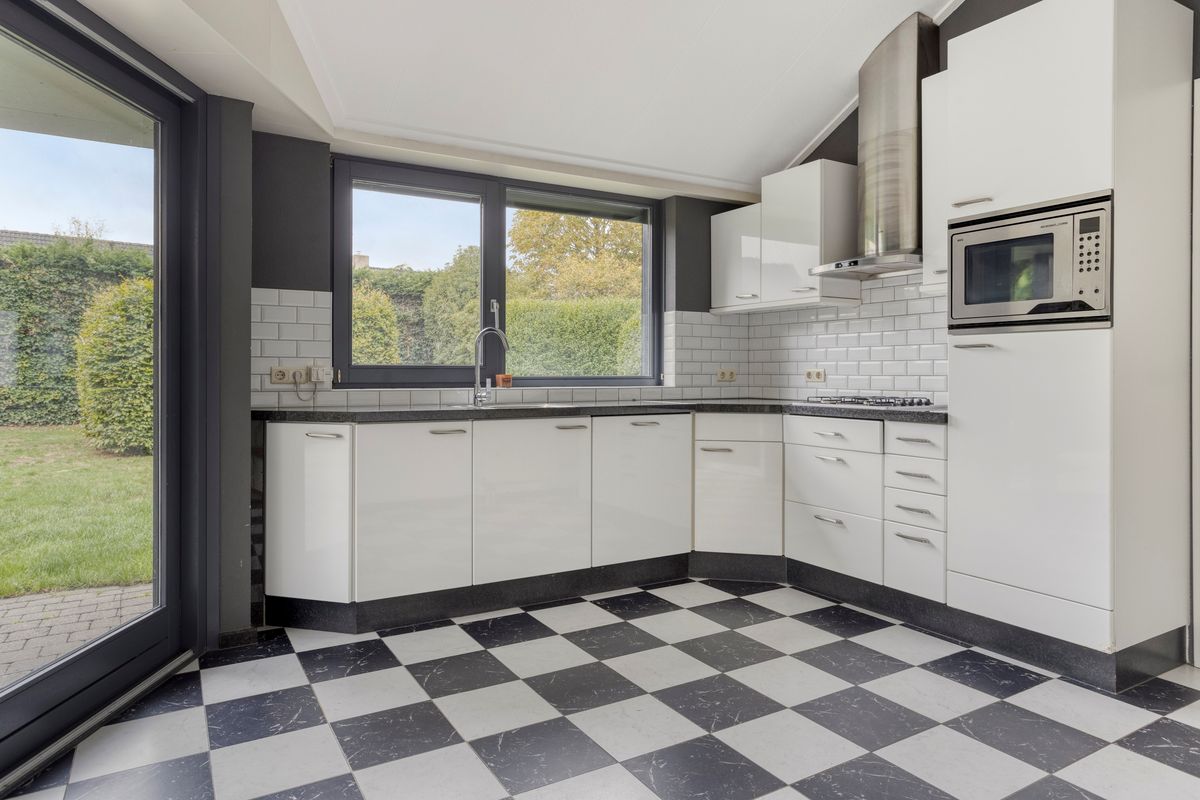 In de woonkamer én in de keuken zijn schuifpuien naar het terras en u hebt een fraai zicht op de tuin. Naast de keuken is de bijkeuken waar de wasmachine, droger en eventueel een vriezer geplaatst kunnen worden. Tevens vindt u hierin een wastafel met warm en koud water.