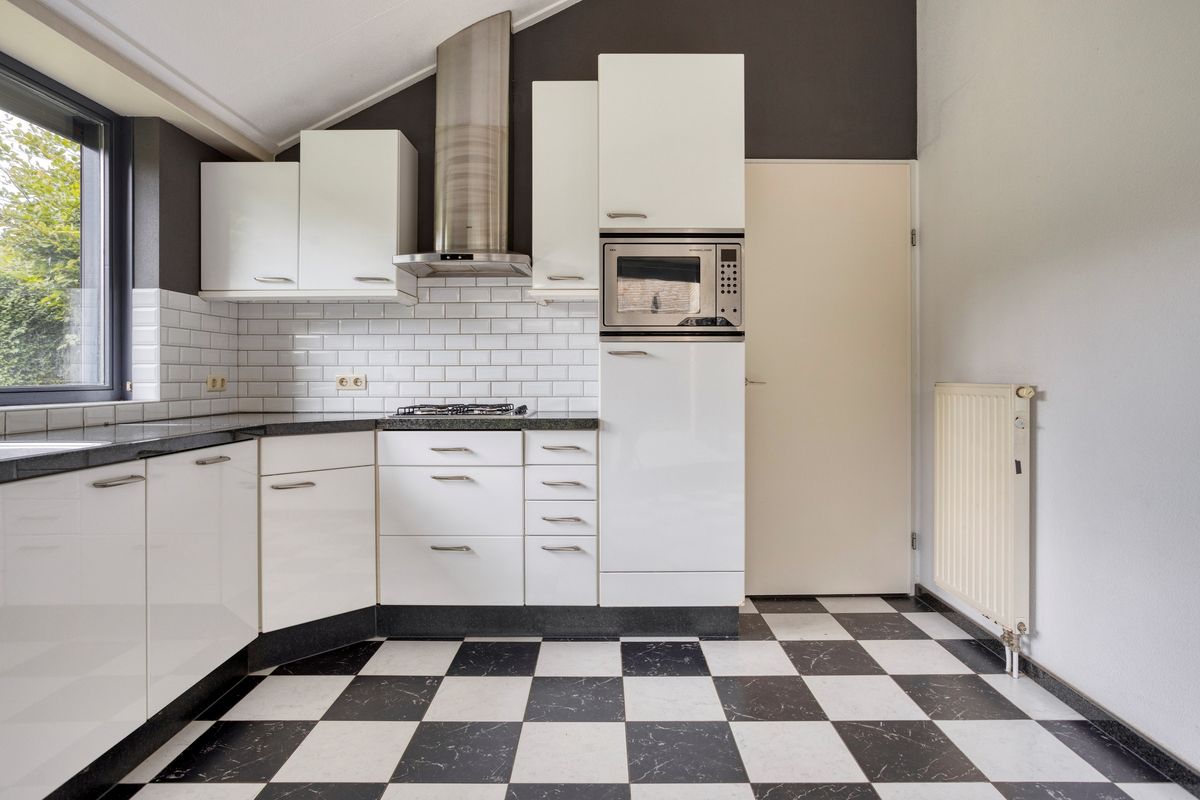 Aangebouwde woonkeuken met diverse inbouwapparatuur zoals koelkast, vaatwasser, gaskookplaat, combimagnetron en wasemkap. De keuken heeft vloerverwarming.