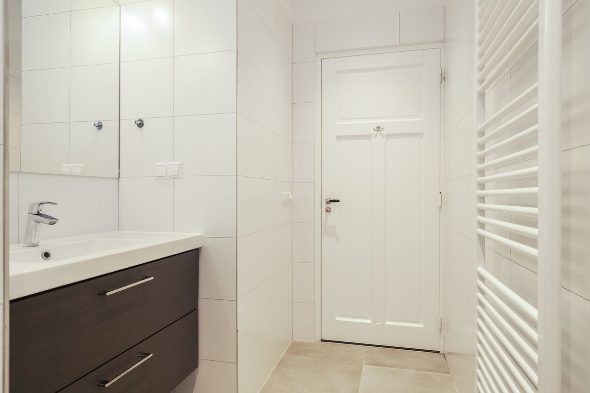 De woning beschikt over twee fijne slaapkamers. In de master-bedroom staat een moderne kast precies in een nis dus netjes weggewerkt. Openslaande deuren naar de fraai aangelegde achtertuin met nette berging voor bv. fietsen. Een moderne badkamer met wastafelmeubel met lades en handdoekenradiator, ideaal om het huis netjes en ruimtelijk te houden.