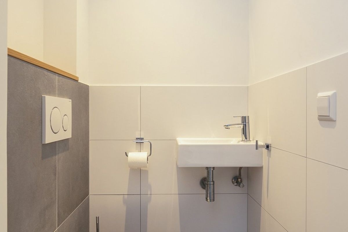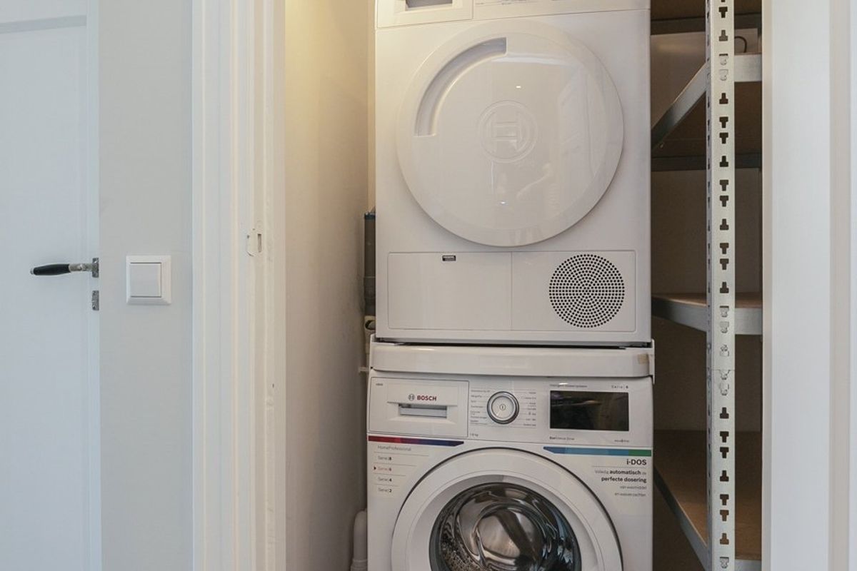 Via de hal kom je in de ruime zit-/eetkamer met een strak afgewerkte, moderne keuken, voorzien van alle gemakken: inductiekookplaat, oven, afwasmachine, koel-vriescombinatie en magnetron. Alles netjes ingebouwd en perfect afgestemd op de ruimte. Alle inbouwapparatuur is van Bosch. Openslaande deuren naar de zonnige voortuin met wijds uitzicht over de laan.